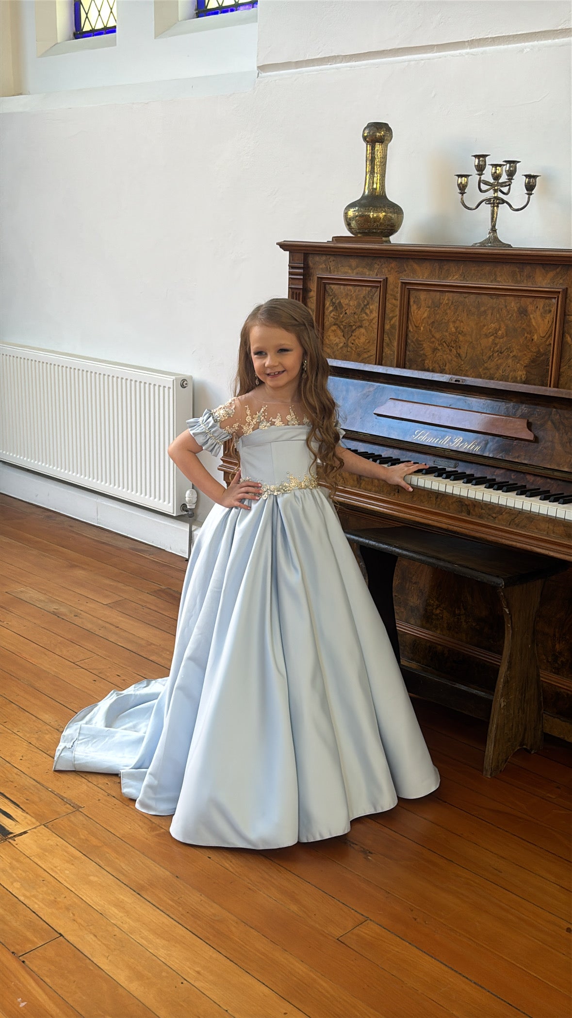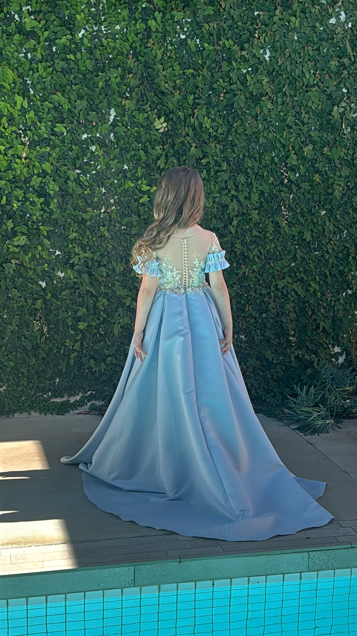 The Arabella Gown features a high scoop neckline with delicate ruffle sleeve detailing and a bodice adorned in floral embellishments. Its elegant silhouette flows gracefully, creating a romantic and ethereal look.