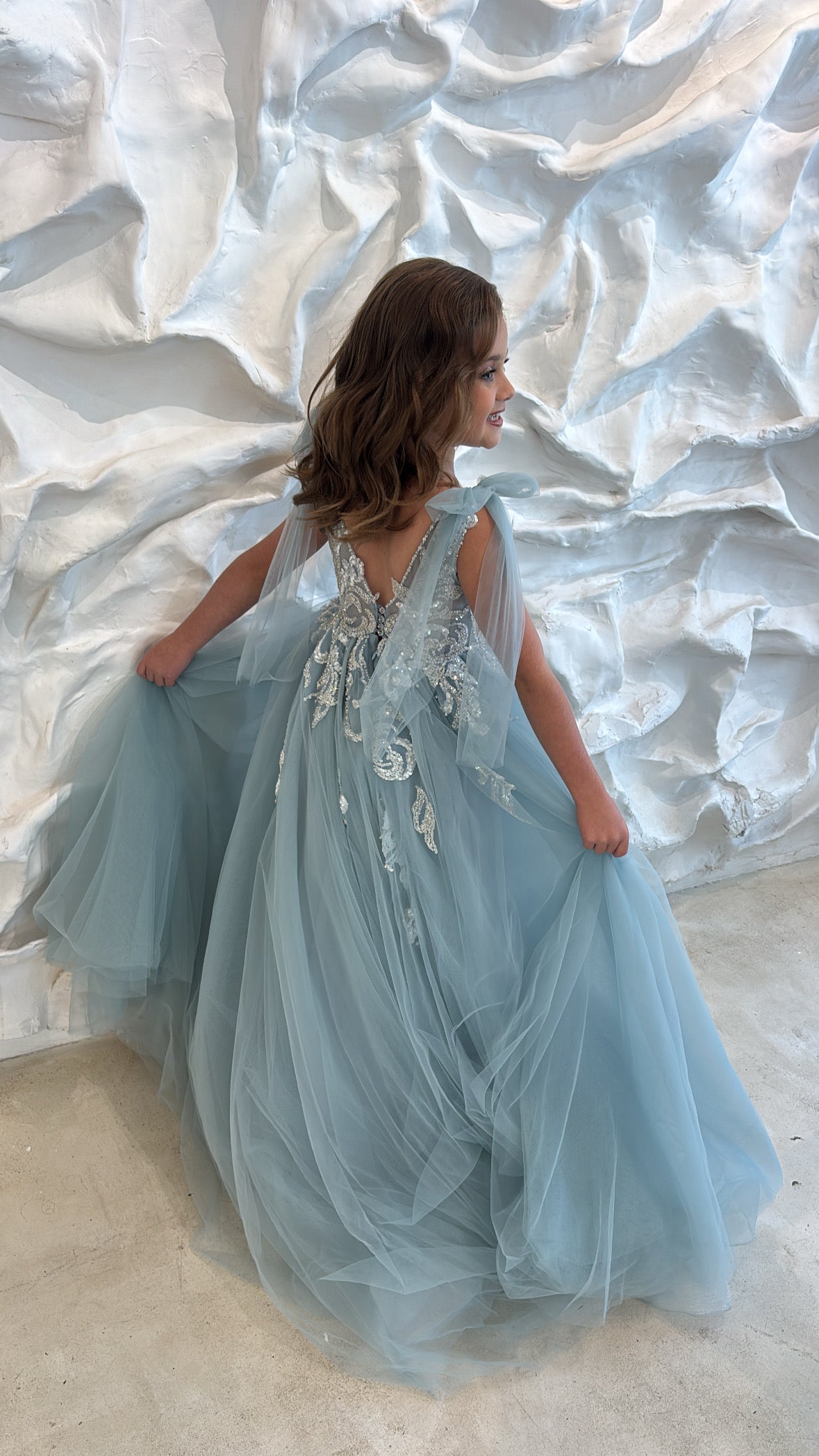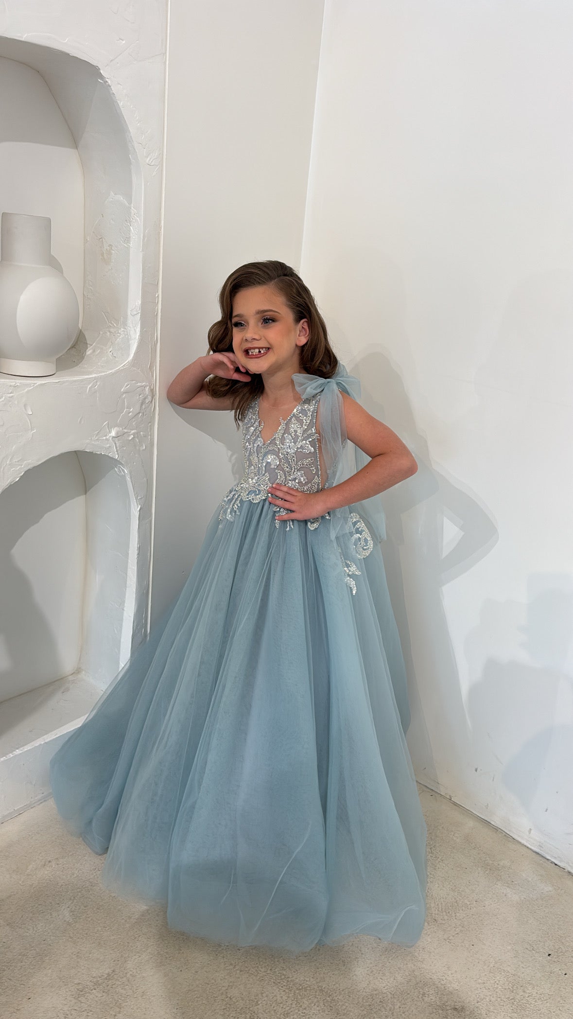 The Bridgette Gown features a graceful A-line silhouette with sparkling blue embellishments on the bodice. Delicate tulle bows add a whimsical, ethereal touch, completing this elegant and refined design.