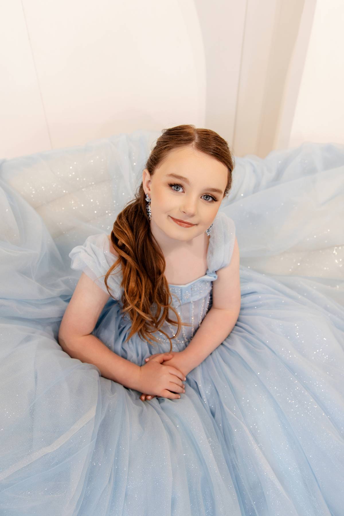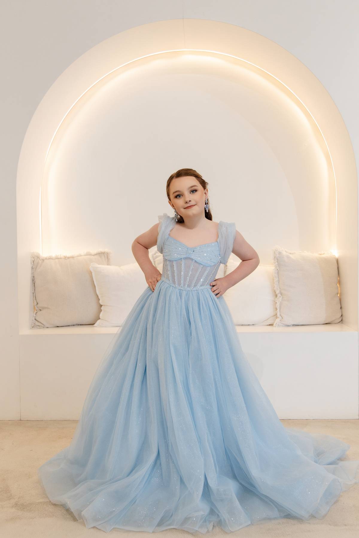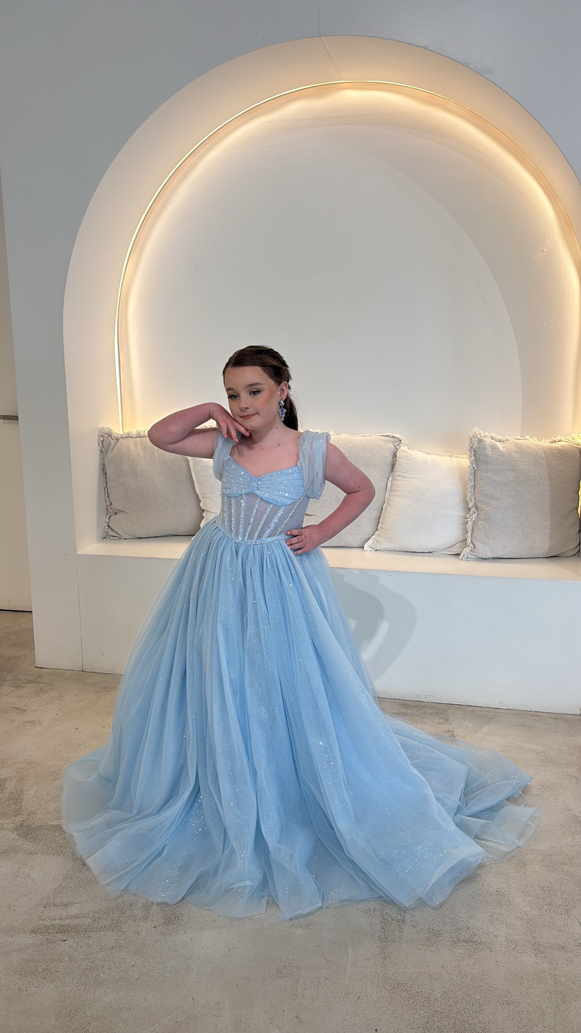 The Leah-Nora Gown features a sweetheart neckline and a sparkling embellished corset bodice. A flowing blue tulle skirt with a dramatic train adds elegance and movement, creating a stunning, ethereal silhouette.