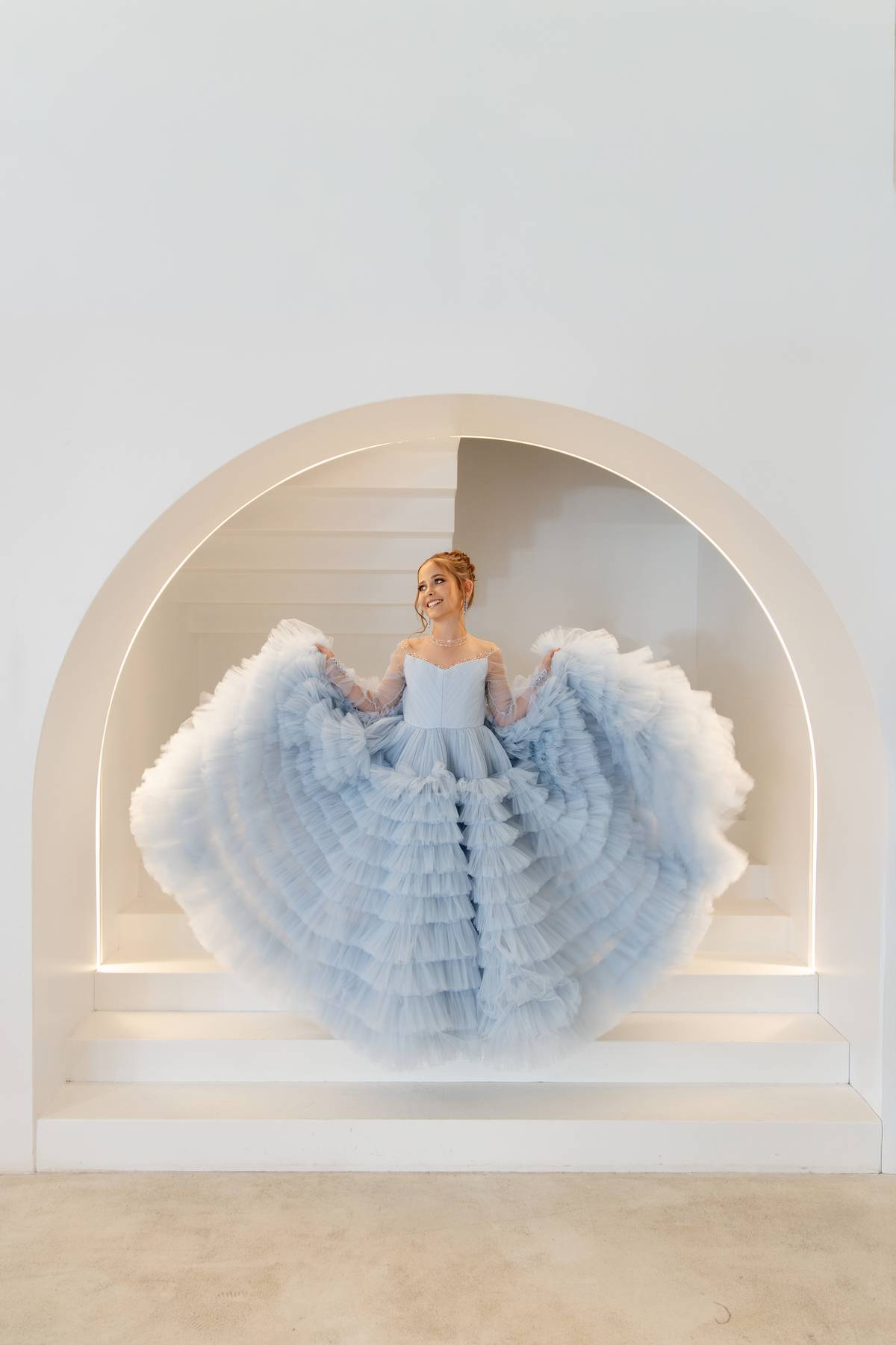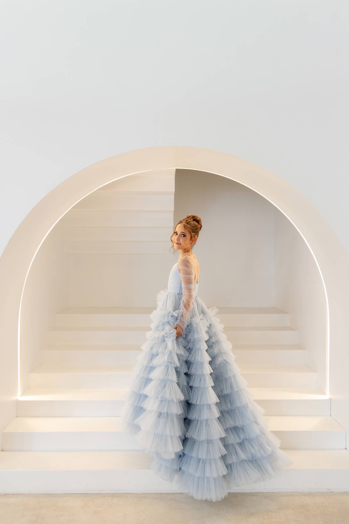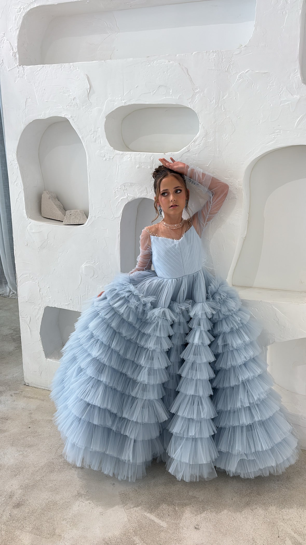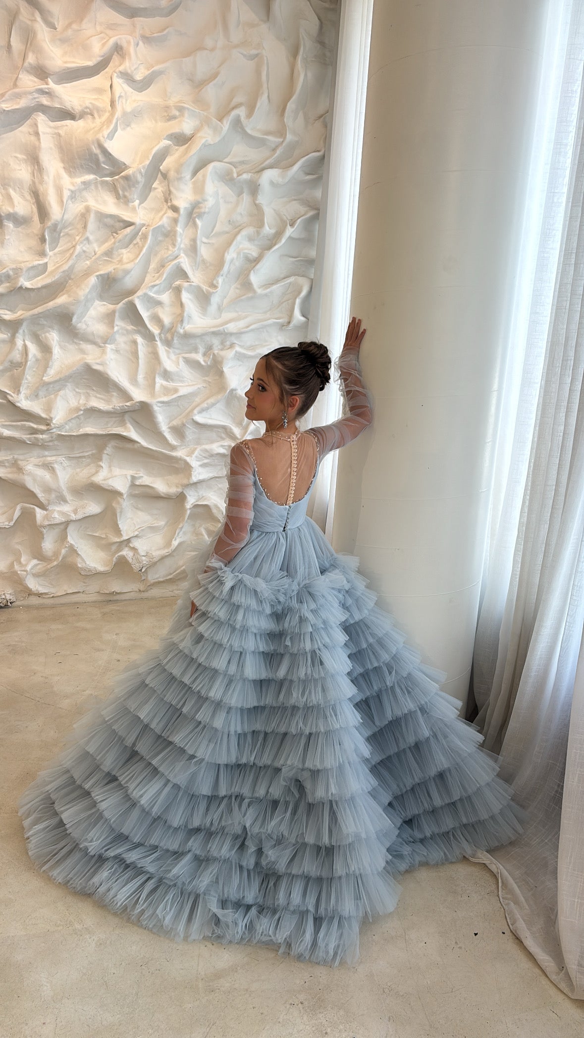 The Miley Gown features long sleeves and a beautifully embellished bodice, paired with a layered A-line tulle skirt. Soft, flowing layers create movement and an ethereal, elegant silhouette.