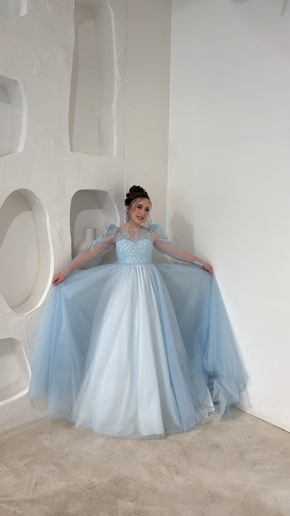 The Tianna-Belle Gown features a high neckline and long sleeves with an intricately embellished bodice. A flowing A-line tulle skirt adds graceful movement, creating a look of refined elegance and timeless beauty.