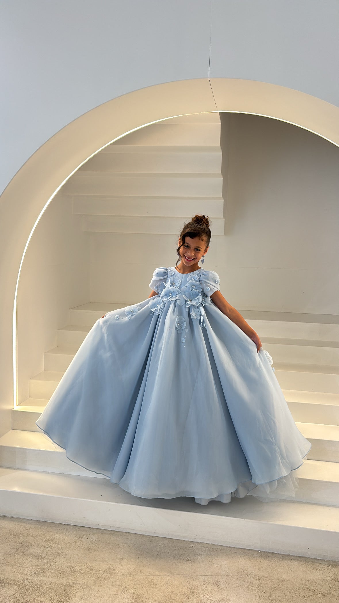 The Wynter-Rose Gown features a scoop neckline with delicate puff sleeves and a bodice adorned in floral embellishments. A flowing tulle A-line skirt adds movement and ethereal charm, completing this romantic design.