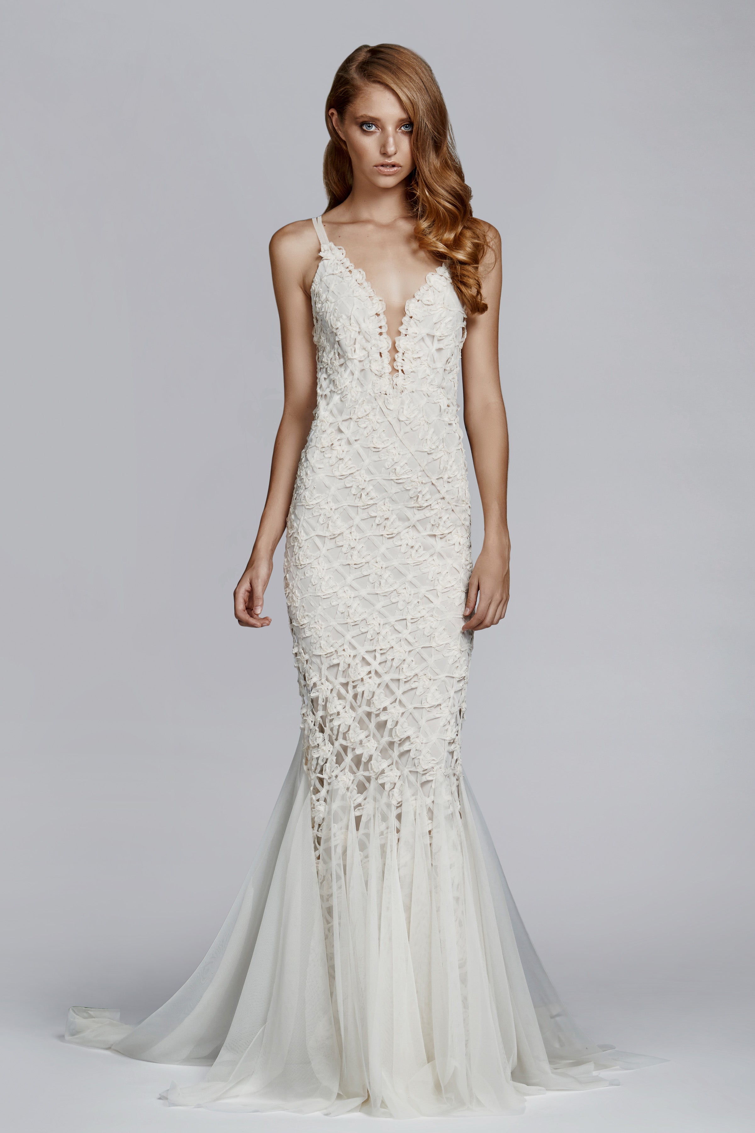 This Battenberg detailed cross hatch ribbon lace gown has a plunging 'V' neckline and a barely there back with shoestring straps. Delicate mesh pieces are used to create a mermaid illusion with?chapel length train. Please note that this dress is no longer available for pre-order. Remaining stock only.