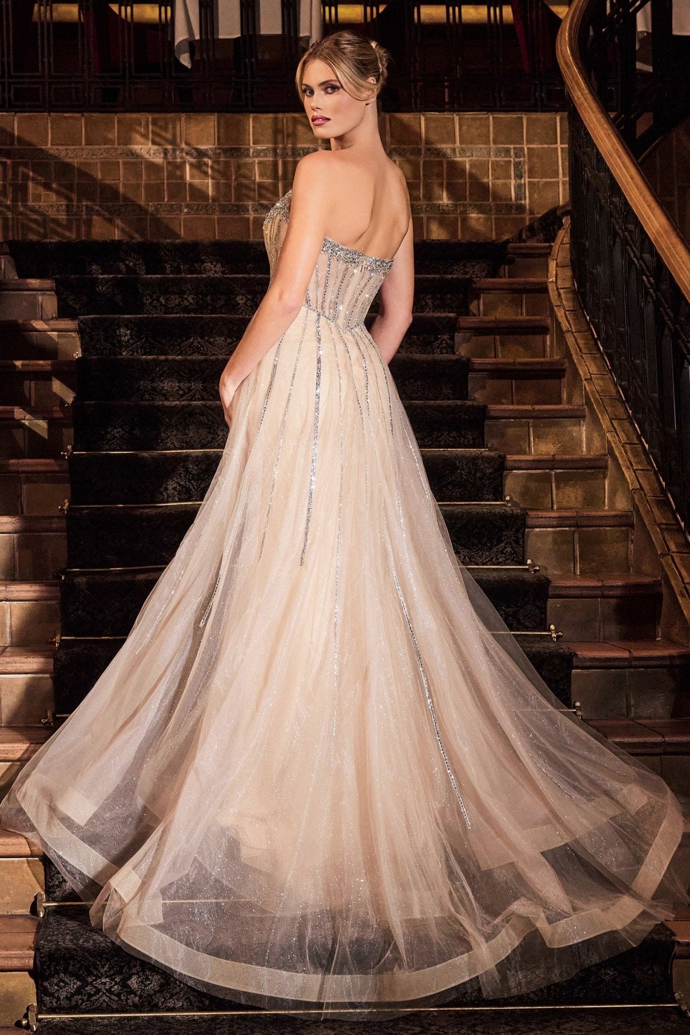 This strapless fitted gown dazzles with linear crystal beading that adds a modern touch of elegance. The structured bodice ensures support and comfort, while the layered tulle overskirt creates a dramatic yet graceful silhouette. Perfect for prom, black tie events, or red-carpet premieres, this dress embodies sophistication and glamour.