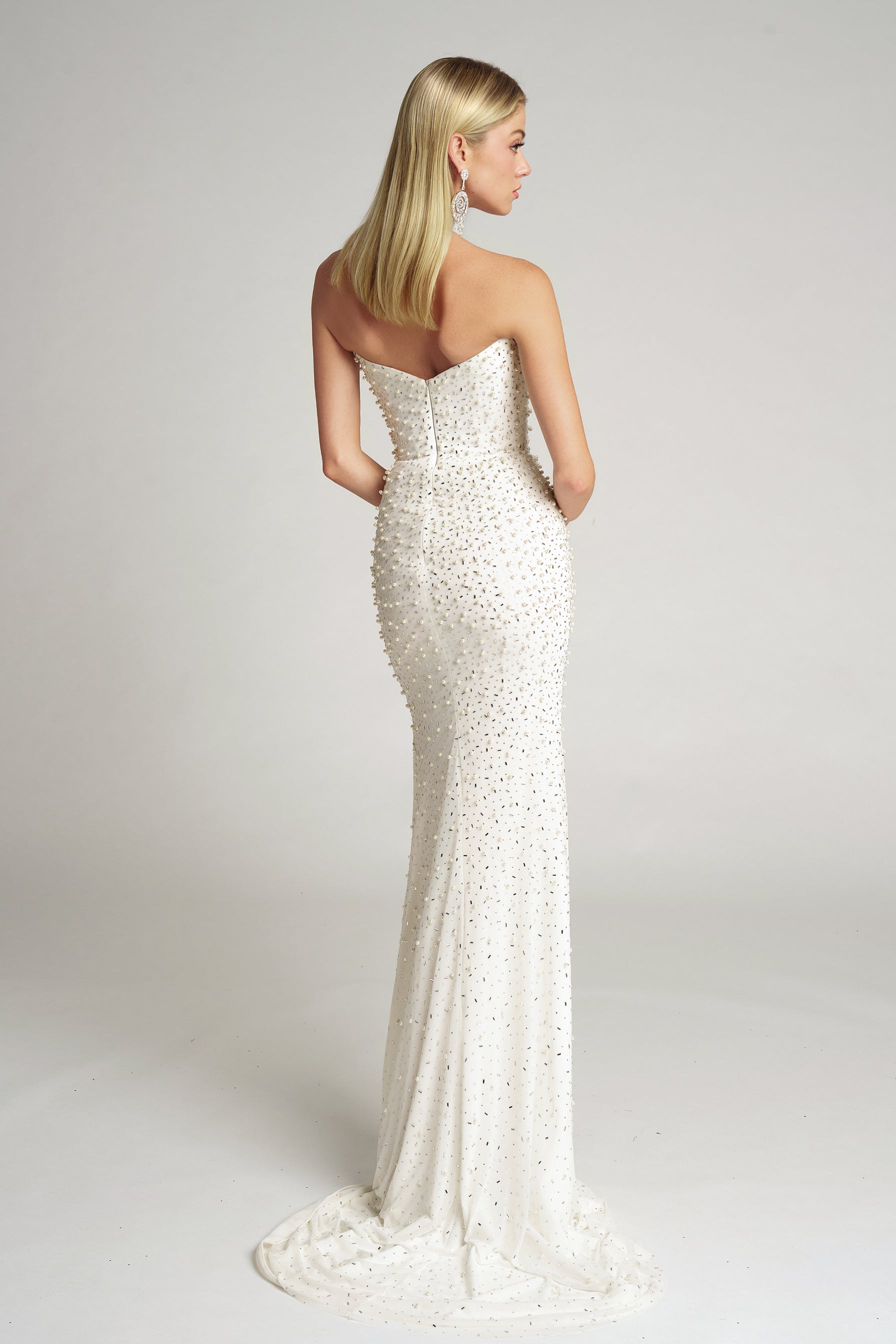 PS26006 features a sculpted bodice that highlights the figure in a sleek, hourglass silhouette. Covered in intricate bead embellishments, the design sparkles beautifully with every movement. A daring thigh-high slit adds a modern touch of allure, while the matching embellished choker completes the look with effortless sophistication.