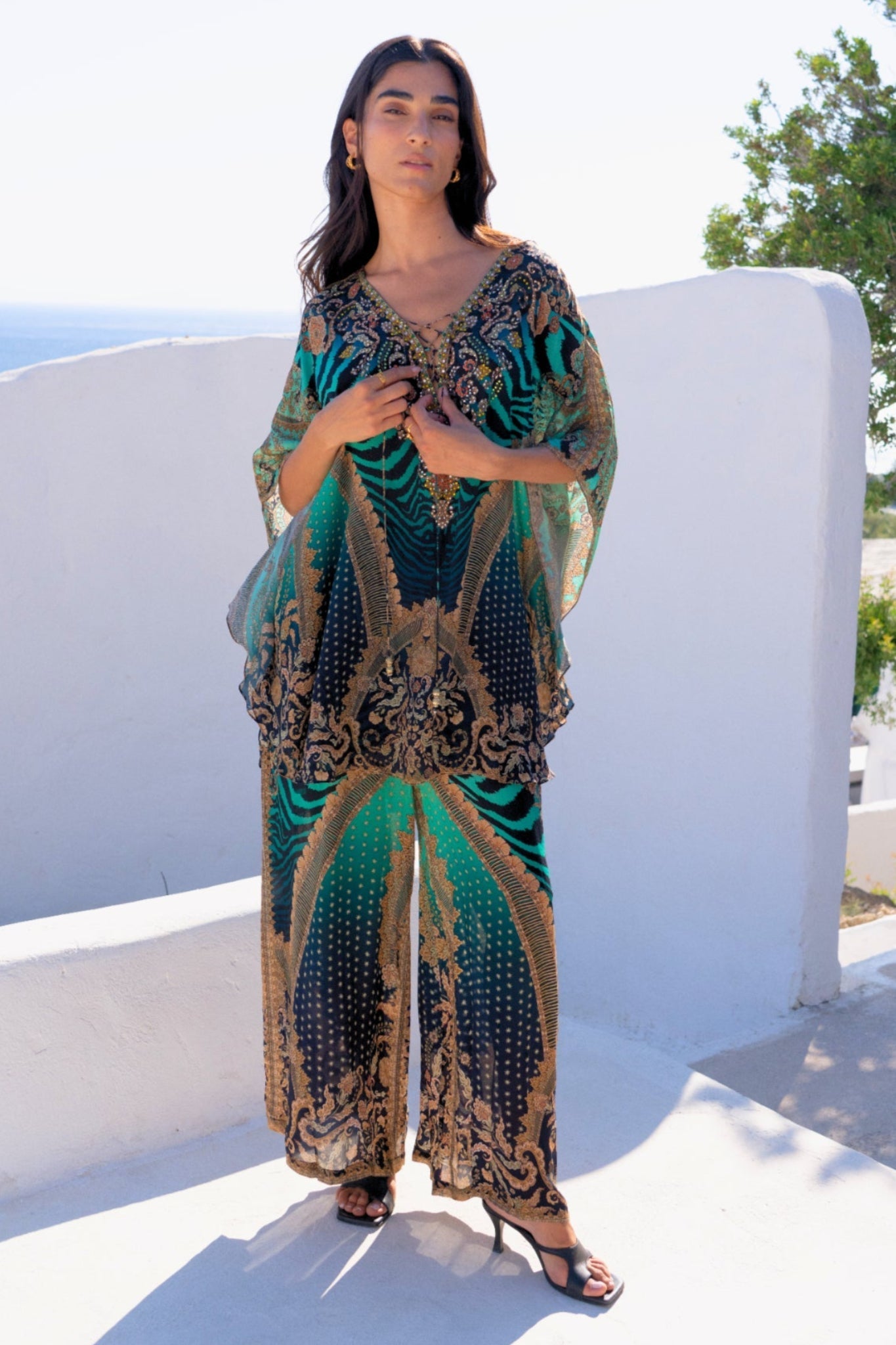 Experience bold elegance with the Emerald Empress Trousers, crafted from luxurious viscose silk for a soft, flowing feel. Featuring vibrant emerald and turquoise hues accentuated by striking black zebra stripes, these trousers command attention. The adjustable waist drawstring ensures a perfect fit, while side pockets add practical convenience. Overlaid with intricate golden paisley and baroque-inspired motifs, they blend exotic flair with refined style—ideal for making a confident statement wherever you go.