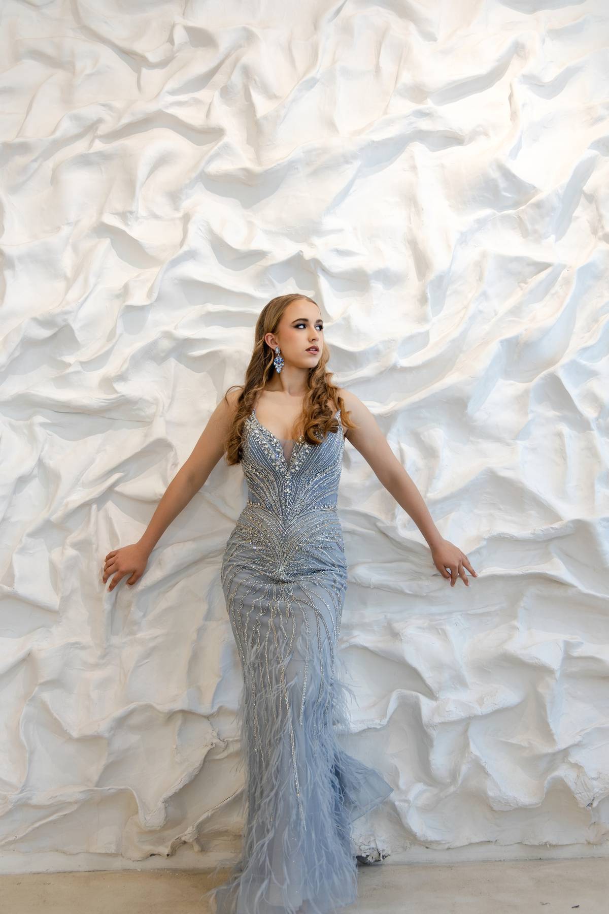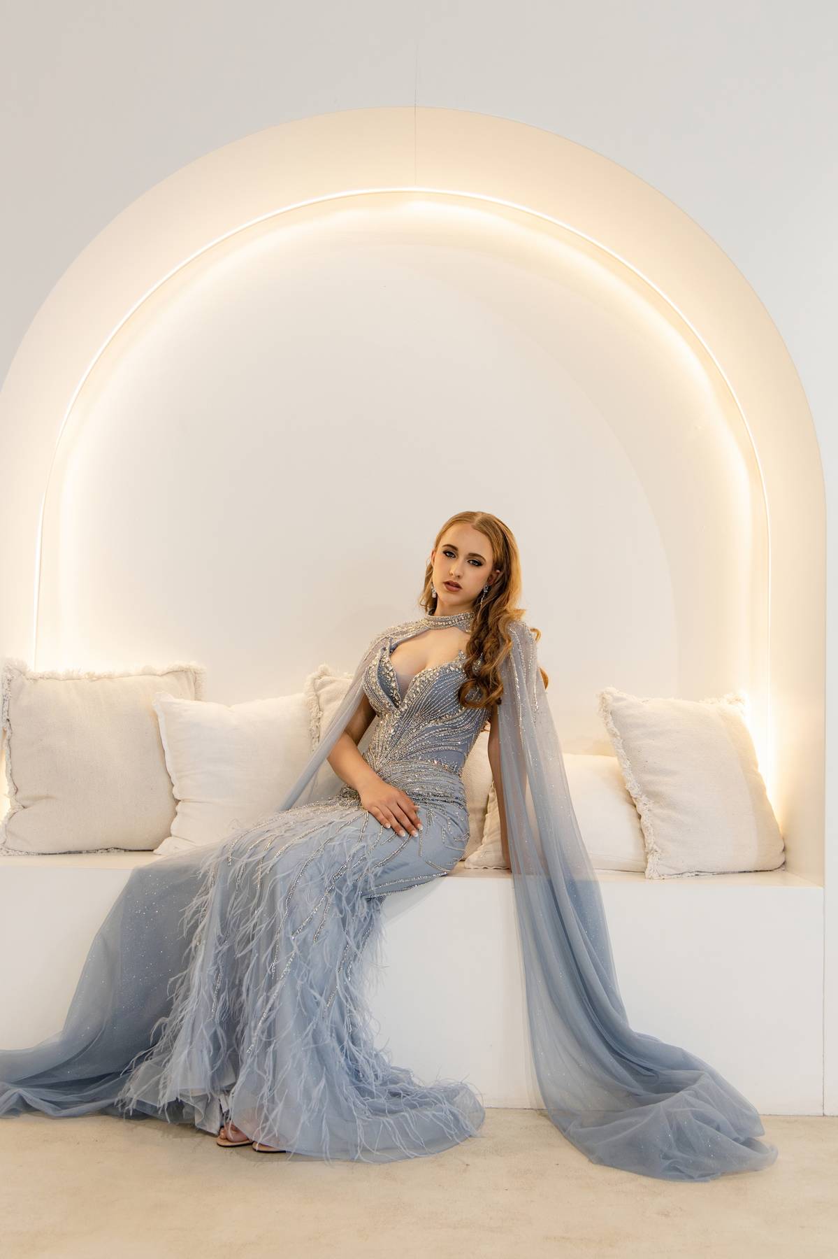 The Amaja Gown enchants with a slimline silhouette in blue, adorned with sparkling silver embellishments. A flattering V-neckline pairs with flowing wings attached at the neck, creating an ethereal, glacial-inspired elegance.