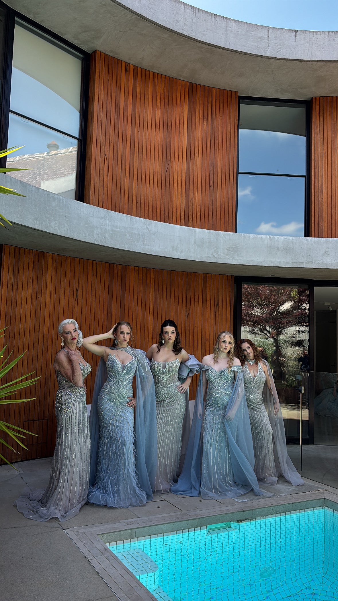 The Tamara Gown shines in a slimline silver silhouette, adorned with sparkling embellishments and a flattering V-neckline. Flowing wings attached at the neck add ethereal movement, capturing icy elegance and dramatic flair.