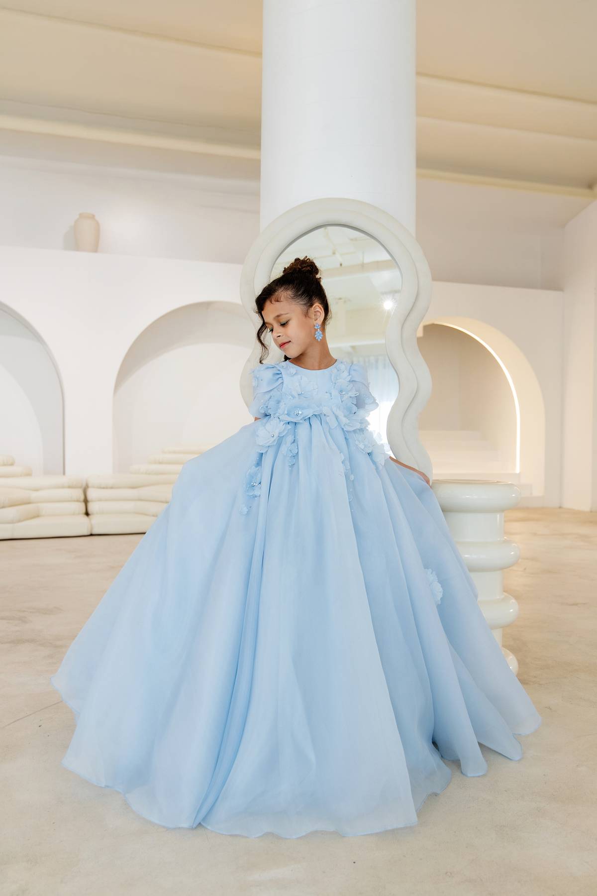 The Wynter-Rose Gown features a scoop neckline with delicate puff sleeves and a bodice adorned in floral embellishments. A flowing tulle A-line skirt adds movement and ethereal charm, completing this romantic design.
