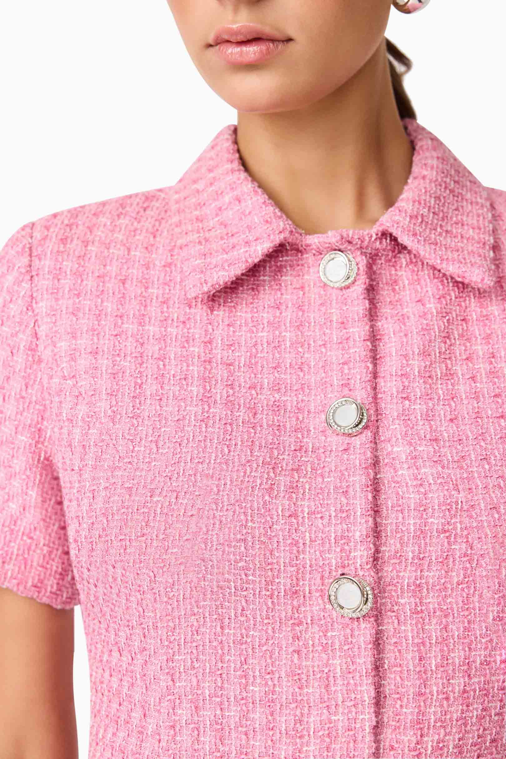 Effortlessly elegant with a hint of vintage charm, the Alia Short Sleeve Mini Dress in Pink is the perfect go-to for polished daywear or low-key events. Crafted from textured tweed fabrication in a soft pink hue, this mini dress is designed with a slim silhouette that flatters the body without clinging.