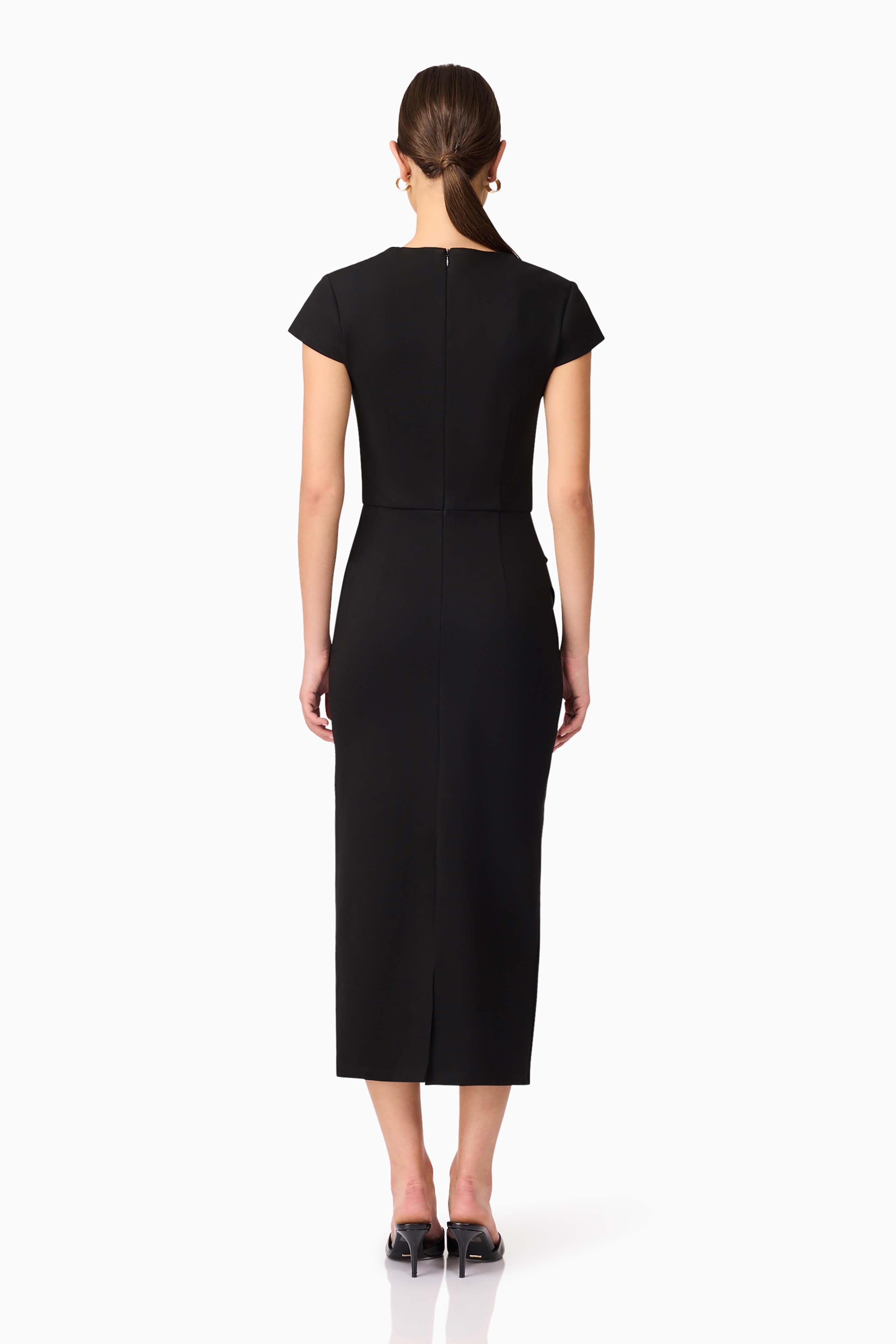 Refined and endlessly versatile, the Alina Fitted Midi Dress in Black is a timeless wardrobe staple designed to flatter. Cut from a structured ponte fabrication, this elegant cap sleeve midi dress offers both comfort and polish, making it a perfect choice for everything from cocktail parties to corporate events.