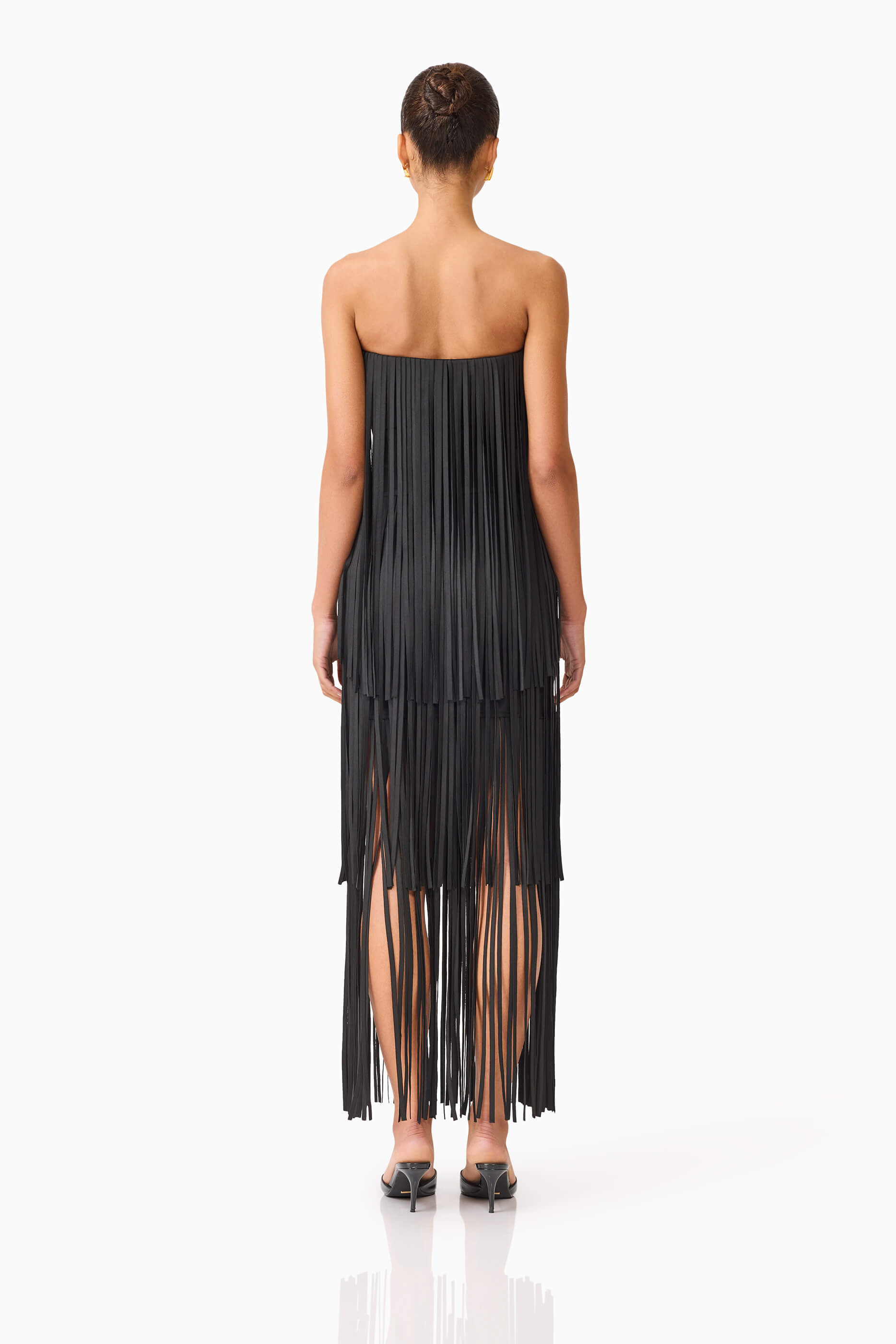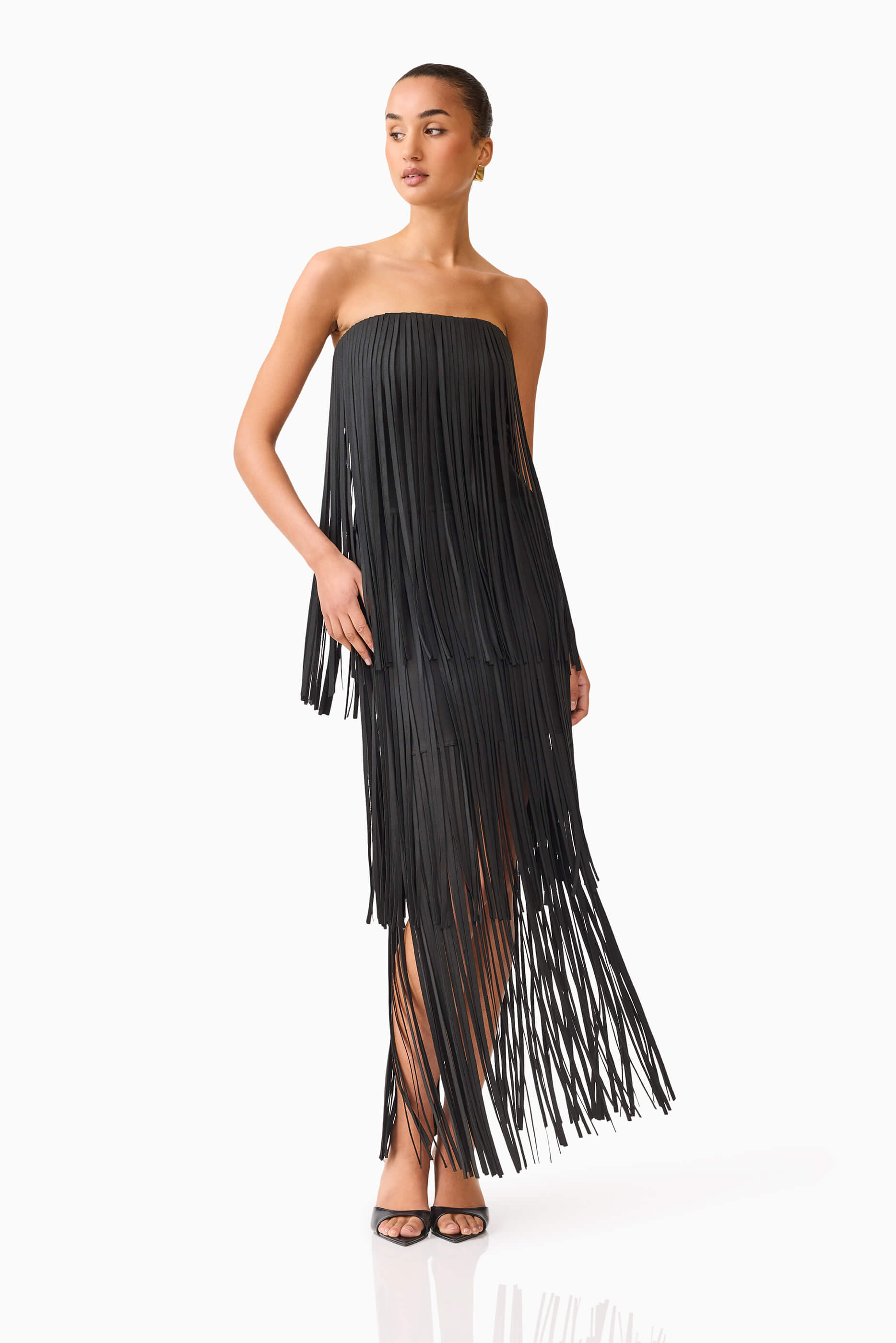 Refined yet impactful, the Alya Tiered Maxi Dress in Black blends sculptural design with fluid detailing for a modern take on evening-wear. Featuring a strapless neckline and fitted silhouette, this maxi dress creates a clean, elongated shape that feels both confident and timeless.