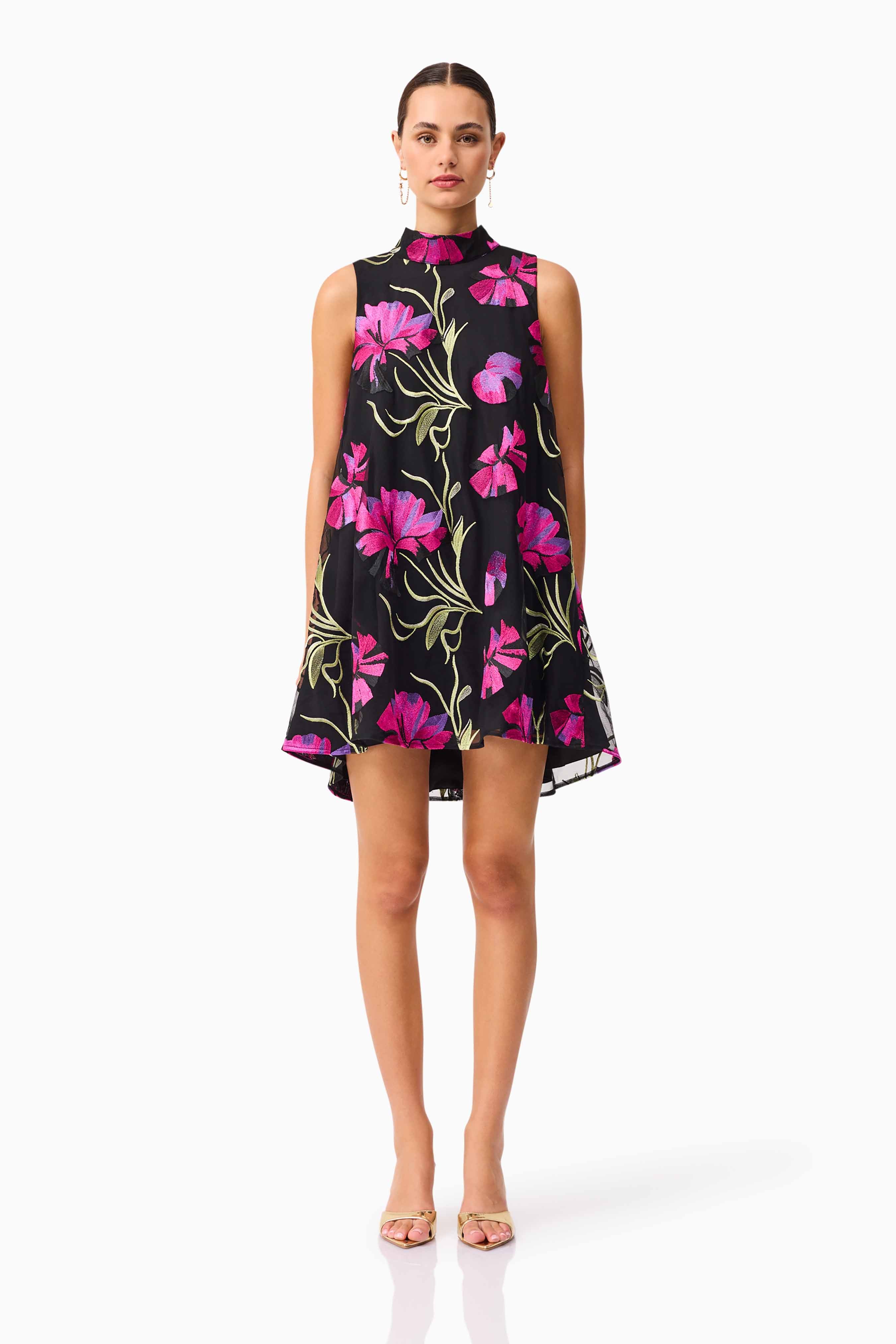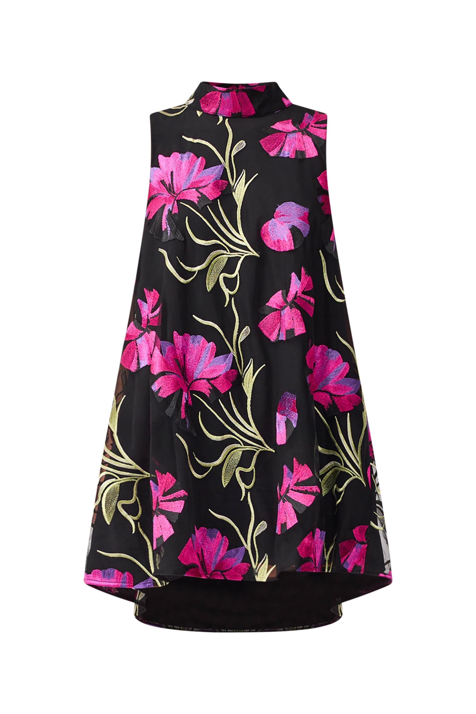 Feminine elegance meets contemporary charm in the Amaya High Neck Mini Dress in Black & Pink Floral. Designed in a delicate floral embroidered mesh fabrication, this dress is a standout for garden parties, long lunches, or dressier daytime events.