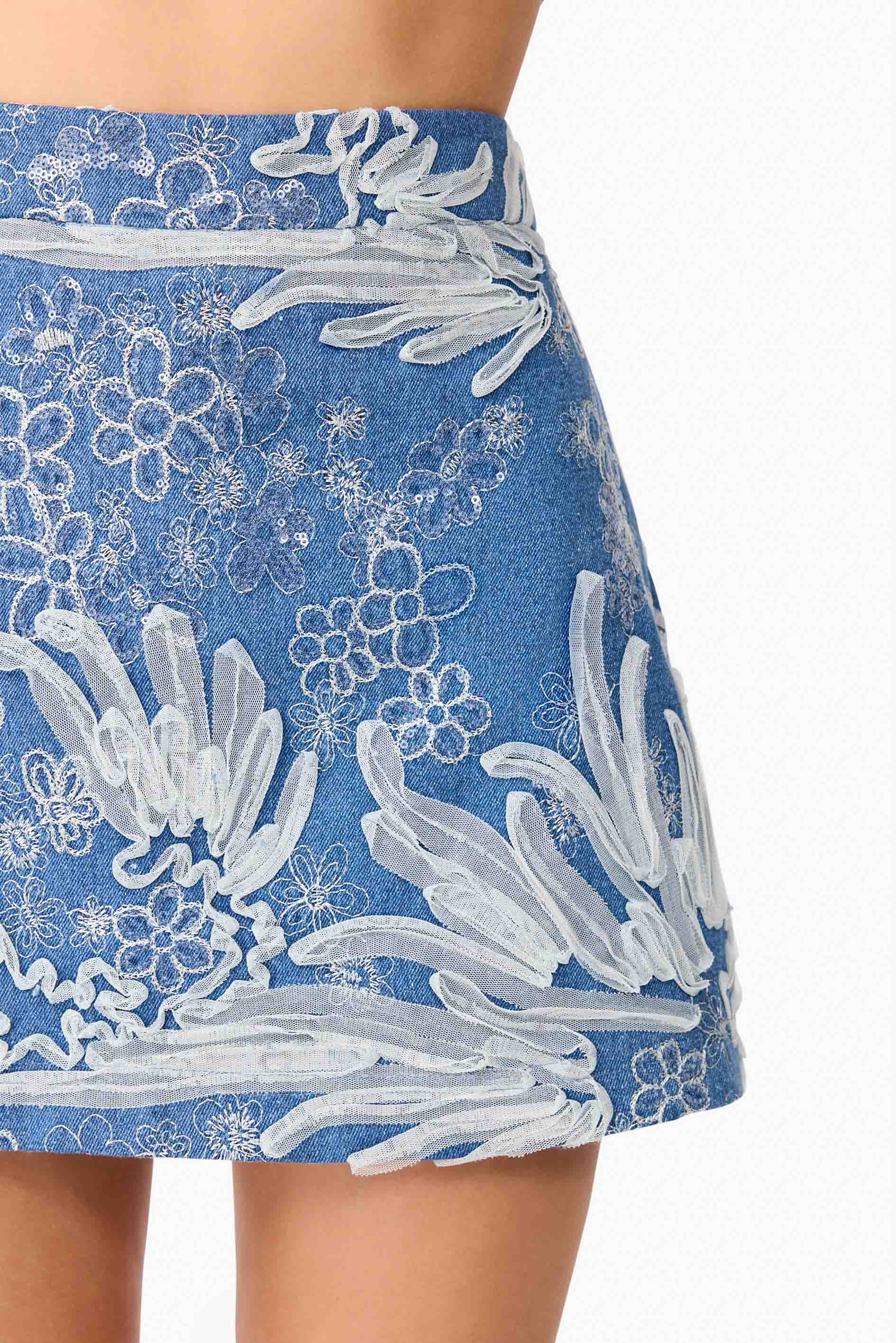 Paired with the matching mini A-line skort, the look is effortlessly balanced. The skort is cut to flatter with a softly flared silhouette, finished with a centre back exposed zipper in matching gold. The unlined denim fabrication ensures movement while the embroidery adds a subtle feminine edge.