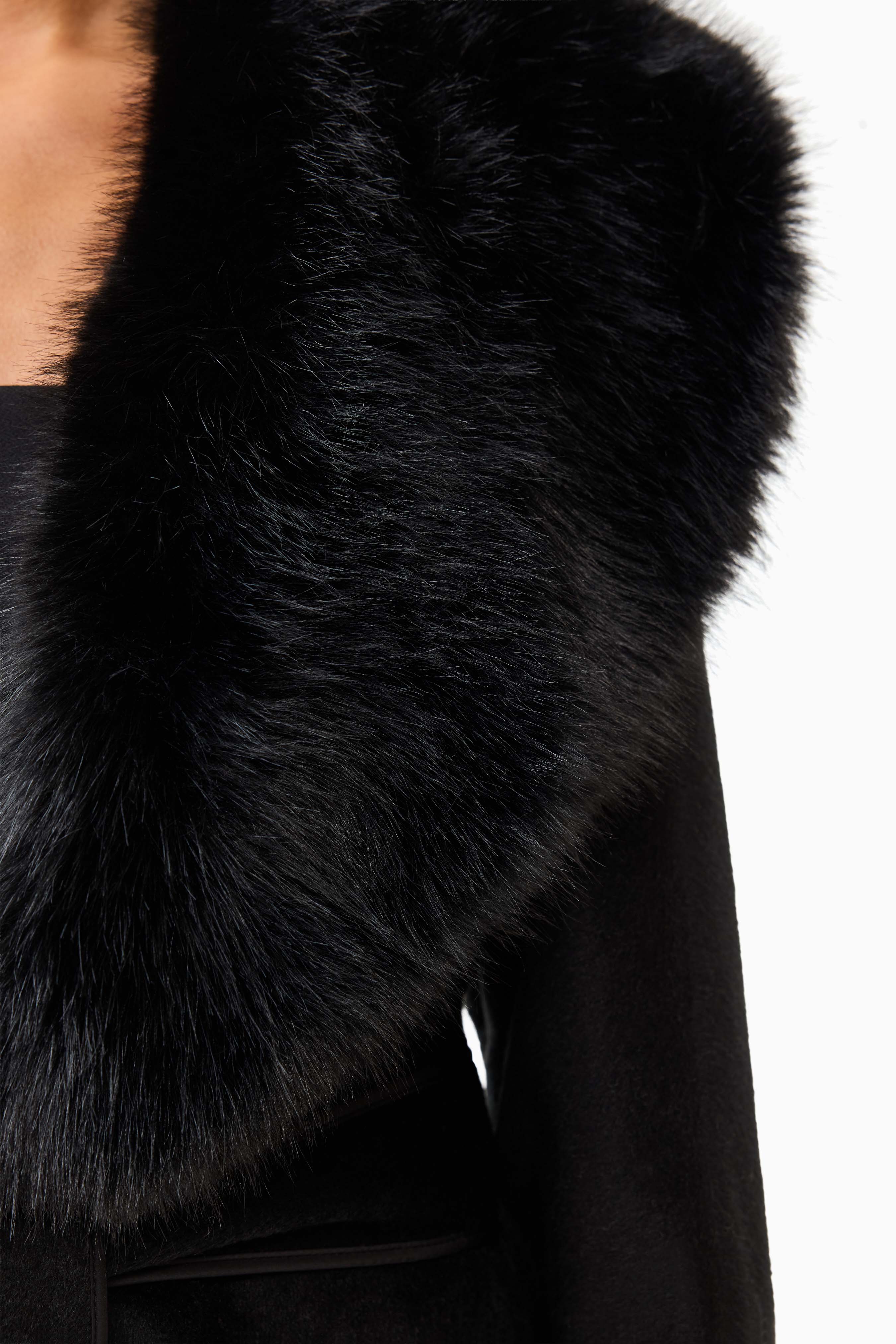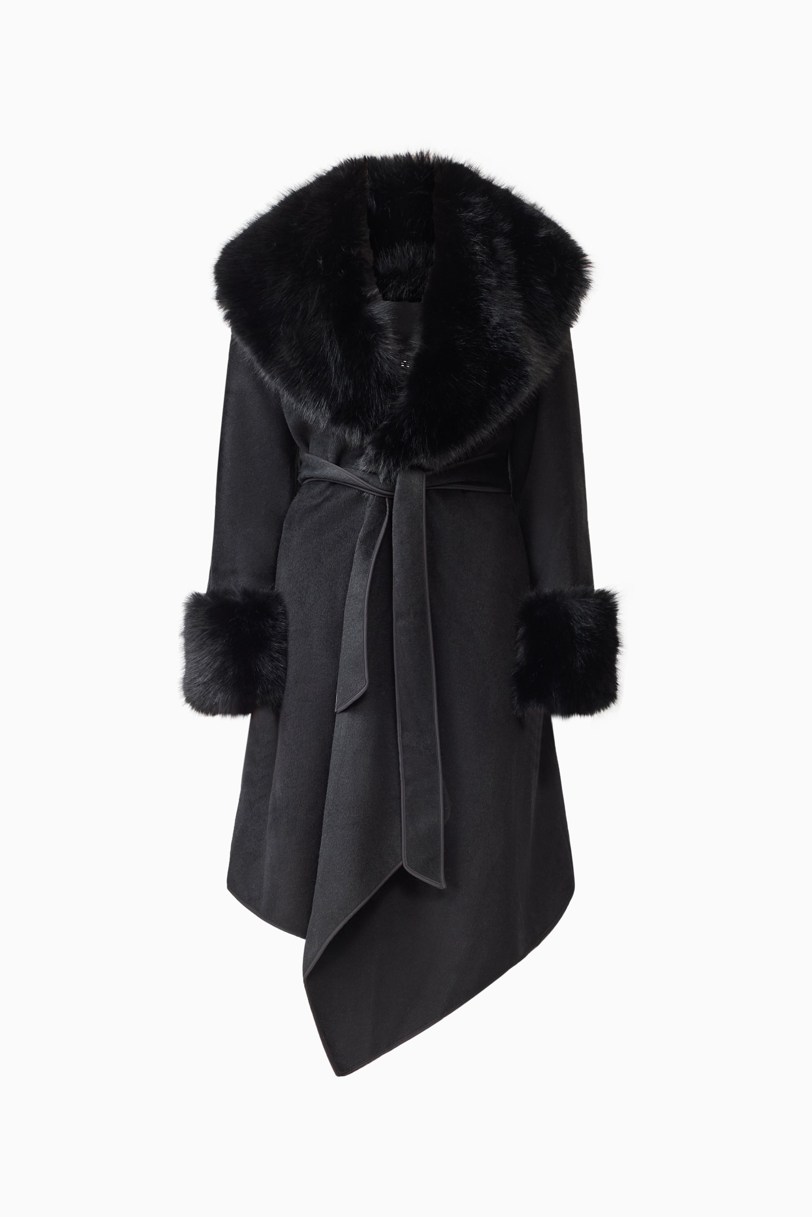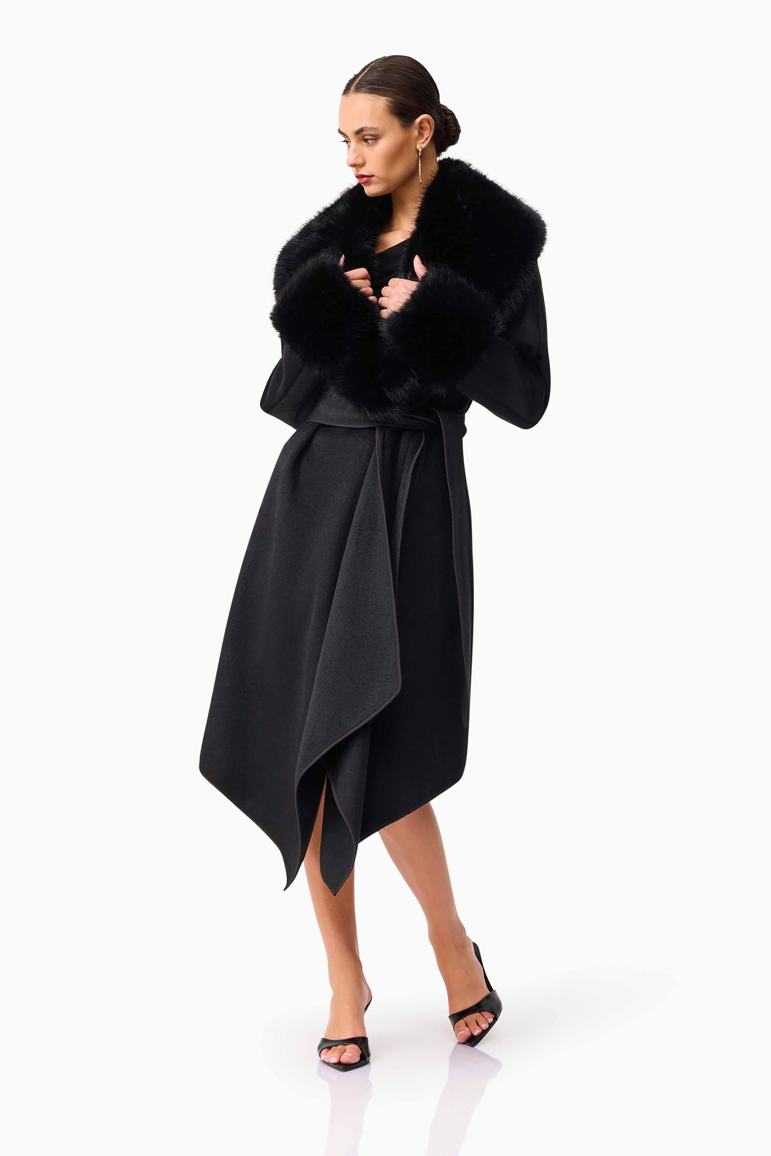 A detachable faux fur collar adds a touch of luxury and versatility — wear it with the fur for a polished winter look, or remove it for a sleek, minimalist silhouette. The tie belt cinches the waist for a flattering fit, while the regular cut allows for easy layering over knitwear or evening ensembles.