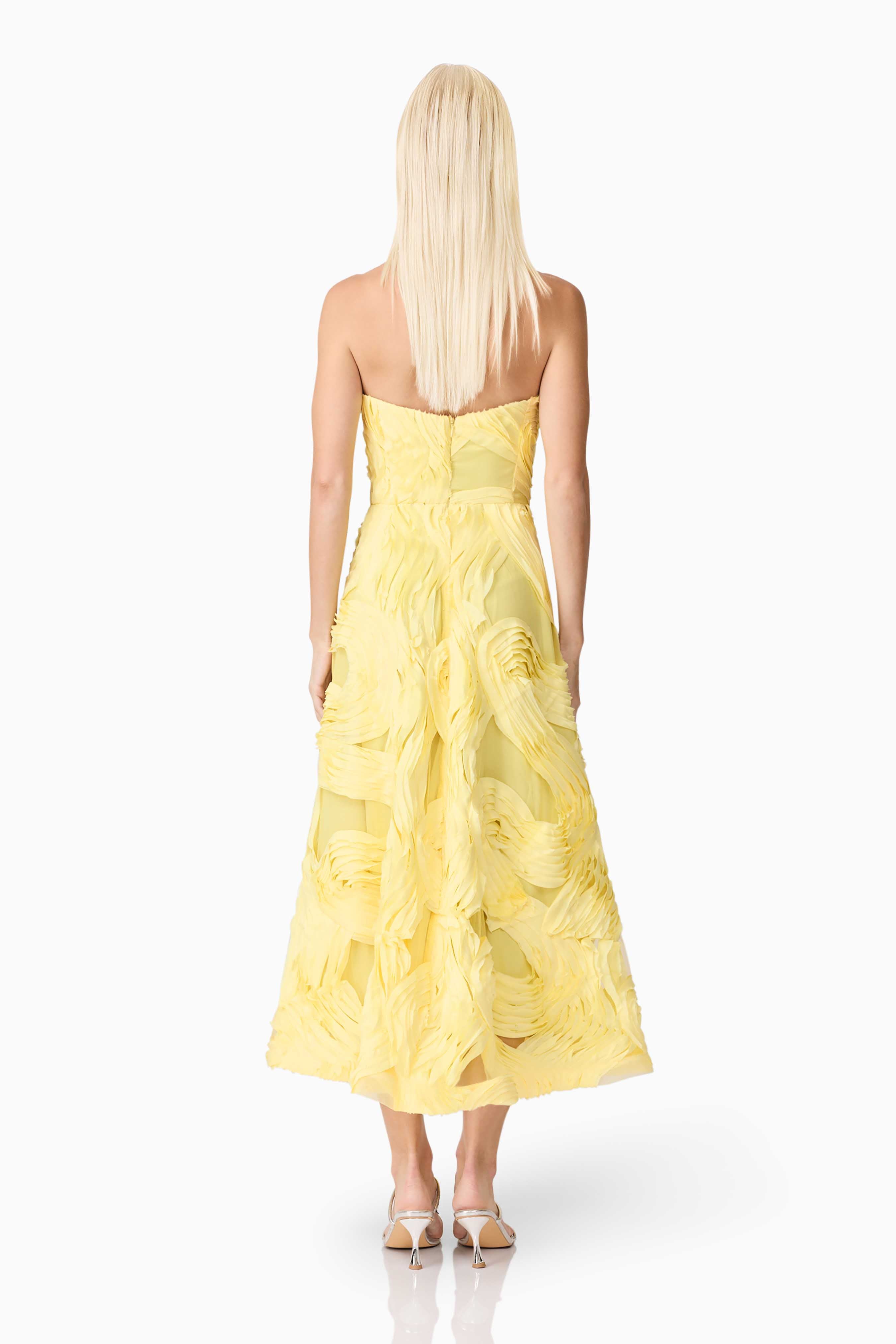 Bright and effortlessly elegant, the Asher Sweetheart Midi Dress in Yellow brings modern romance to life with sculptural details and a fresh colour palette. This strapless A-line midi dress is crafted from intricate 3D special lace fabrication, adding texture and depth to its feminine silhouette.