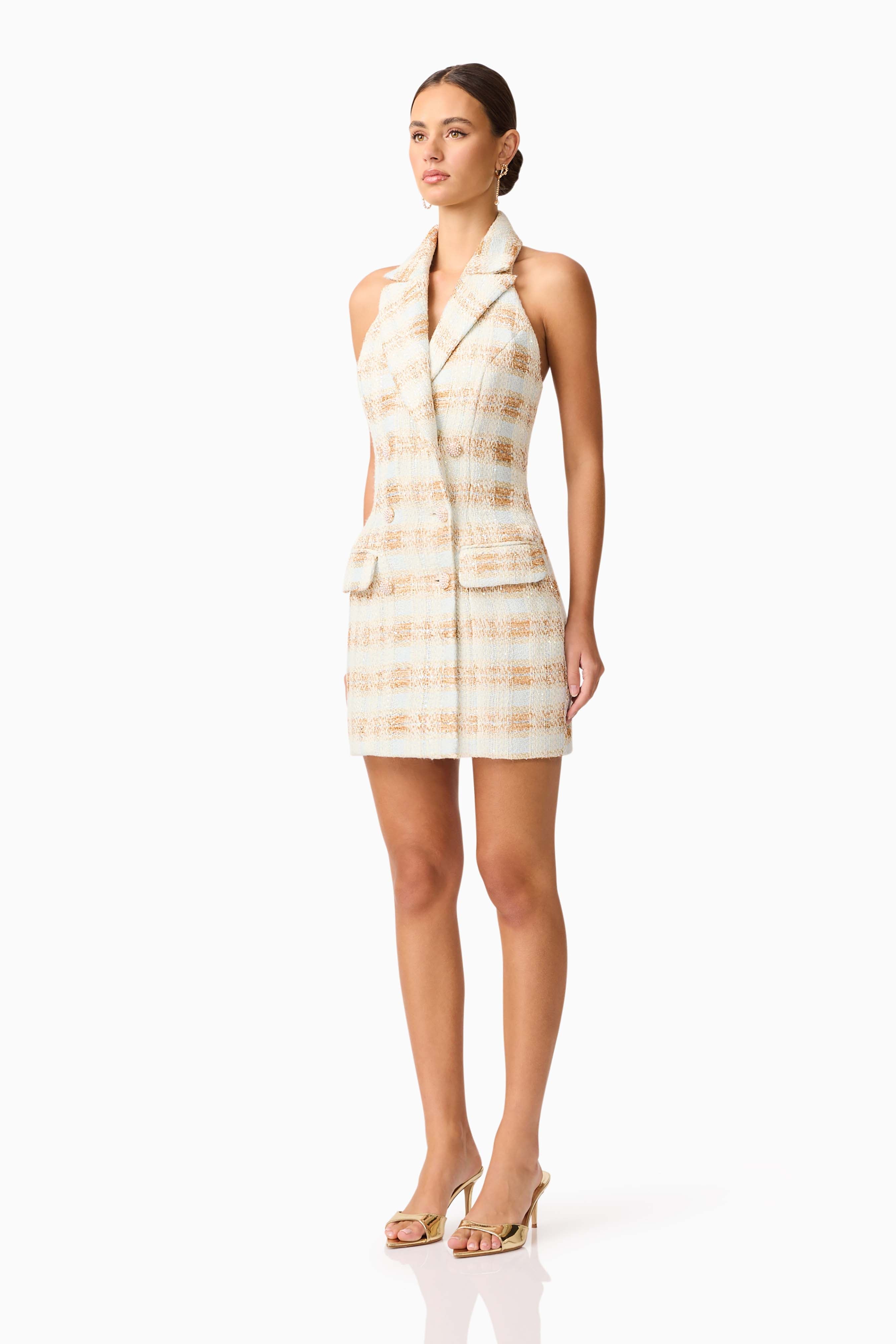 Shine with subtle sophistication in the Ashlyn Halter Mini Dress in White & Gold, a modern silhouette crafted from luxe metallic tweed fabrication. Designed with a structured shape and elegant texture, this mini dress effortlessly blends tailored style with playful charm.