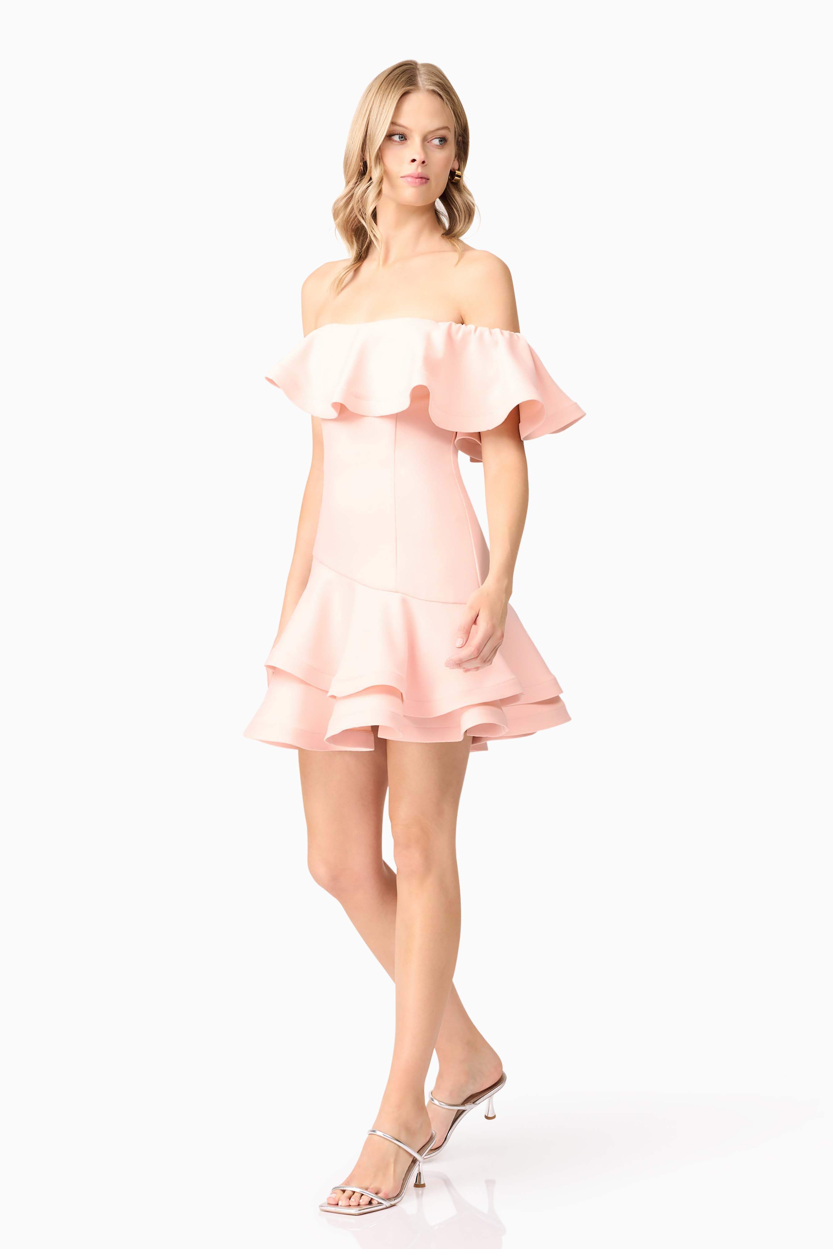 Make a statement in the Ava Strapless Mini Dress in Pink, a chic and playful choice for any special occasion. This stunning pink mini dress features a flattering off-the-shoulder neckline. The soft, cascading frill tiers add a touch of movement, creating a flirty and feminine vibe.