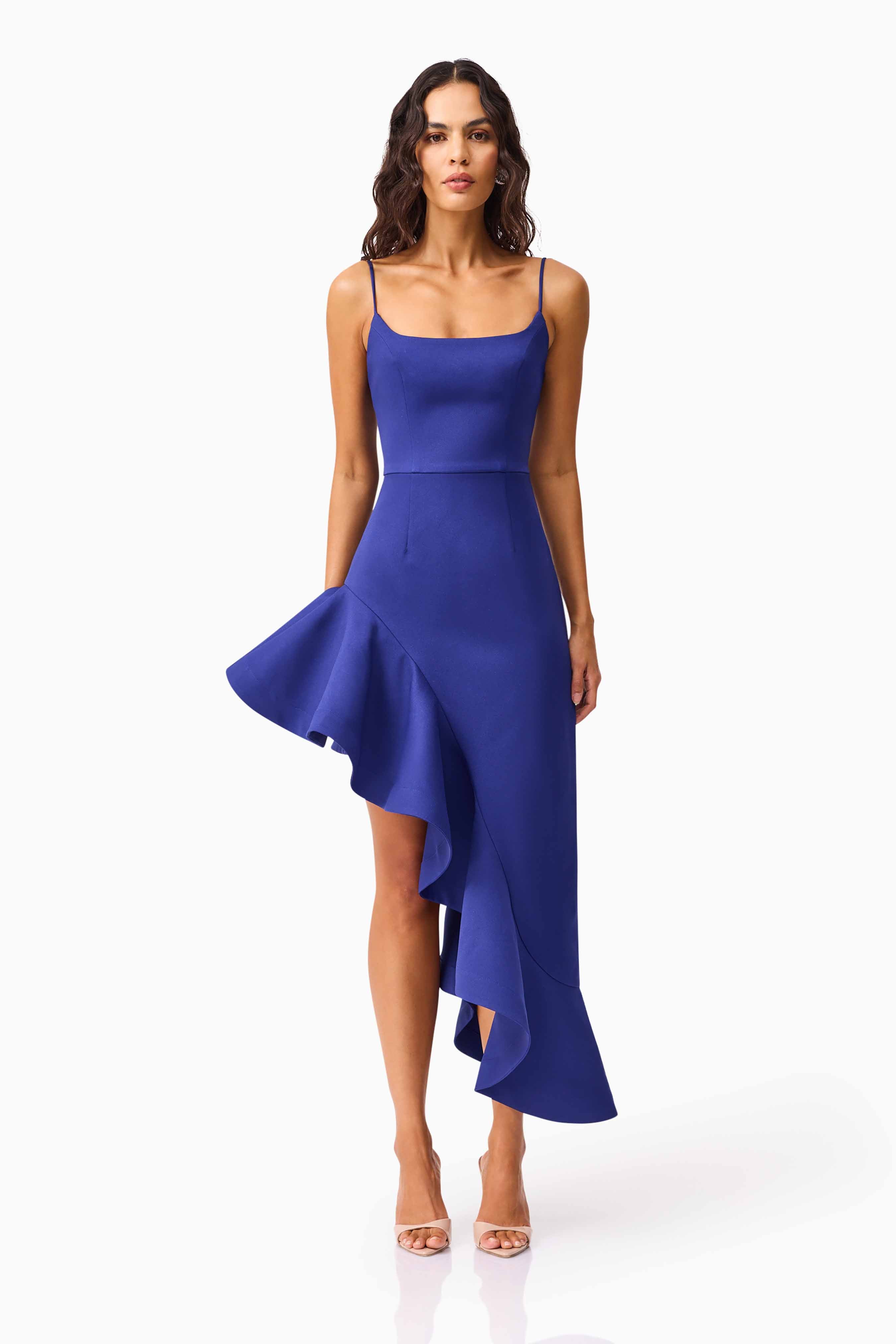 Command attention with the Beatrix Asymmetrical Gown in Blue, a refined silhouette designed to flatter and elongate. Cut from a luxe bonded crepe fabrication, this statement piece features a softly scooped neckline and an asymmetrical frill skirt that adds dramatic movement with every step.