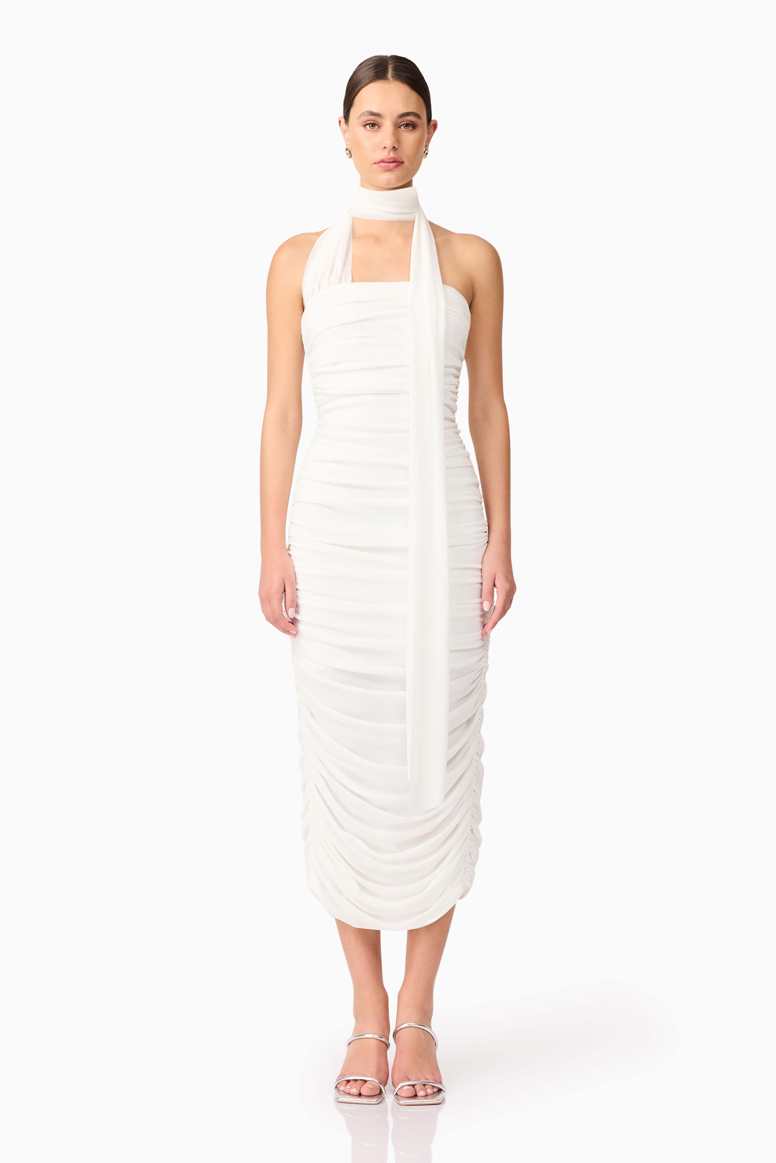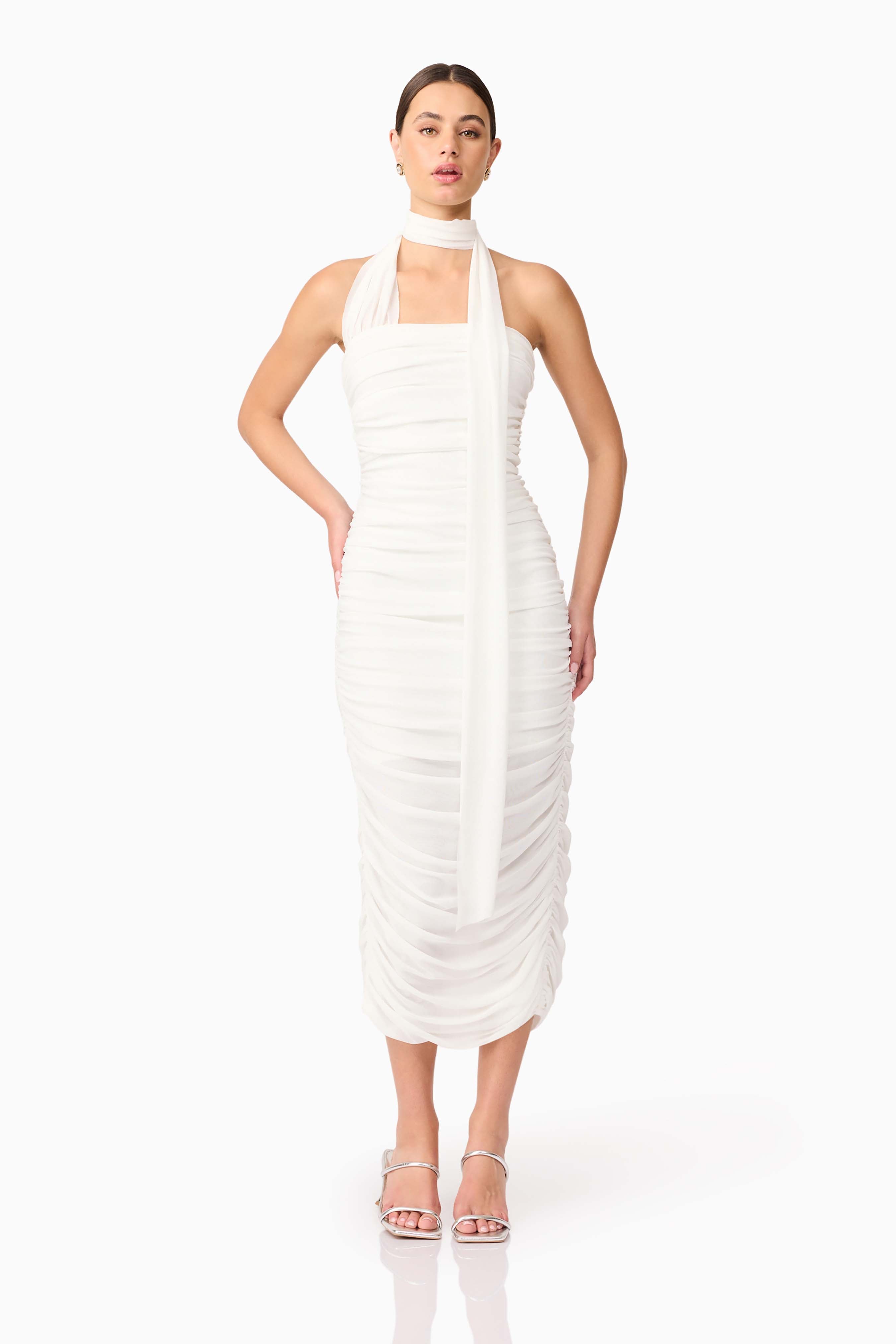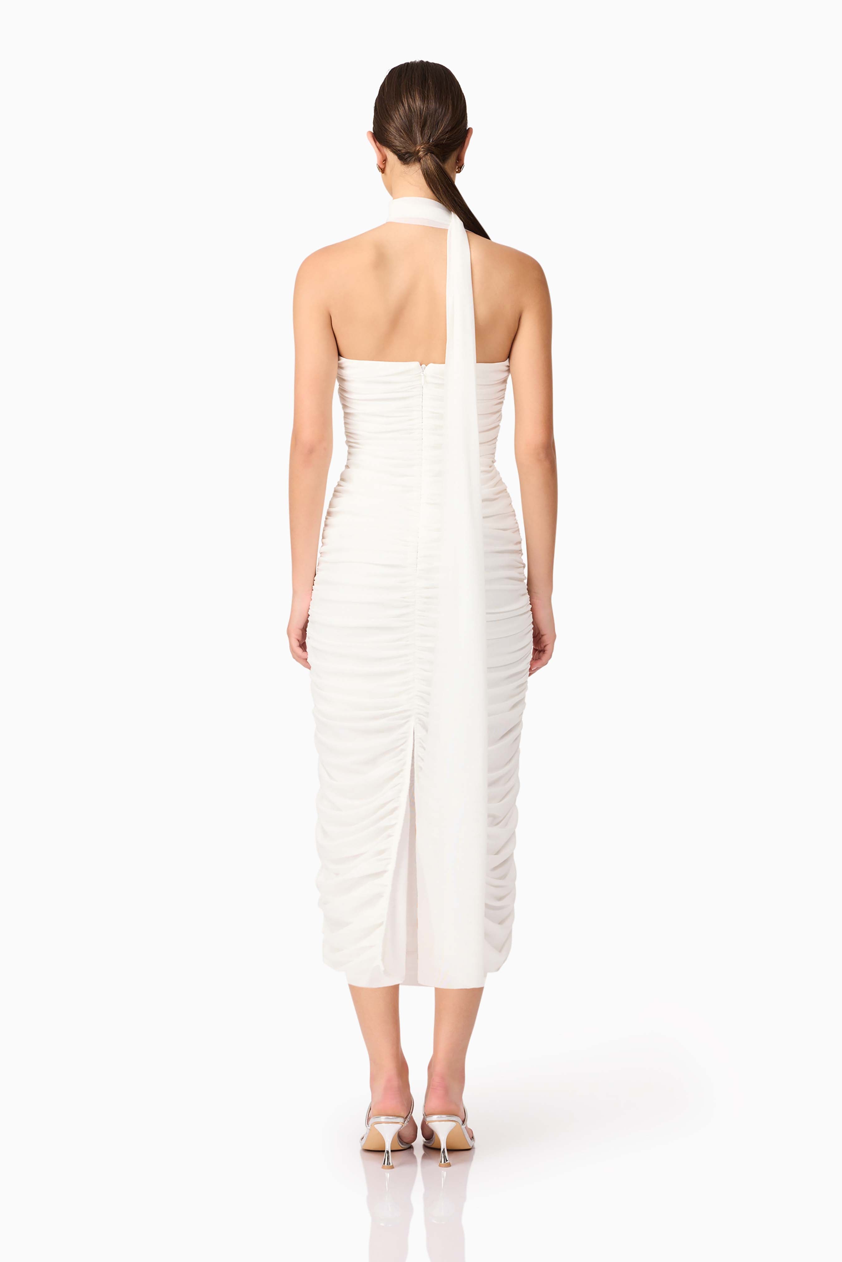 What sets the Darya apart is its graceful neck sash detail—draped gently from the neckline, it adds a touch of romance and elevated styling. The midi length offers elegant coverage, while a centre back split adds both functionality and a subtle flash of skin. Fully ruched from top to hem, the dress enhances your curves without feeling restrictive. A discreet invisible zipper at the back ensures a seamless and secure fit.