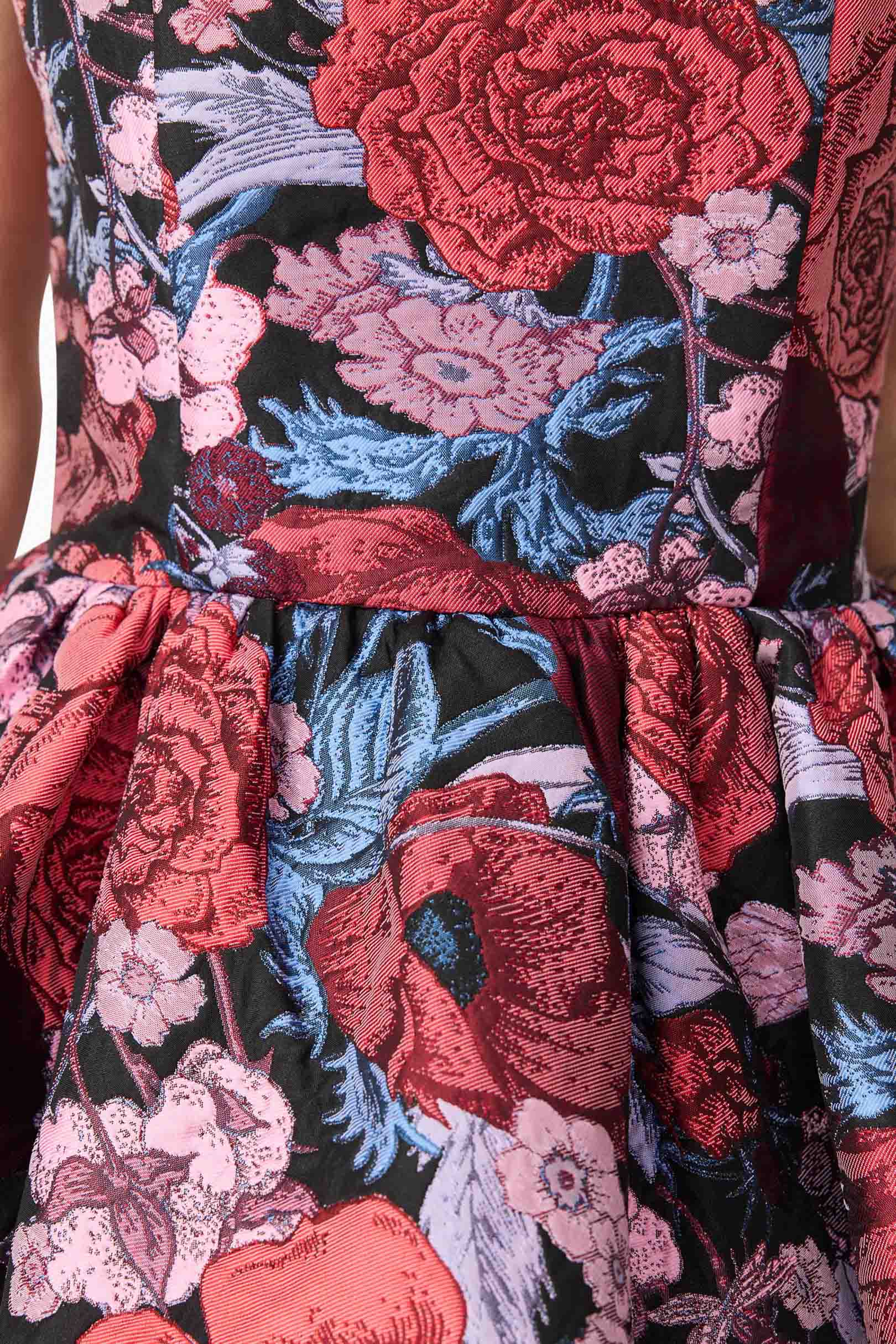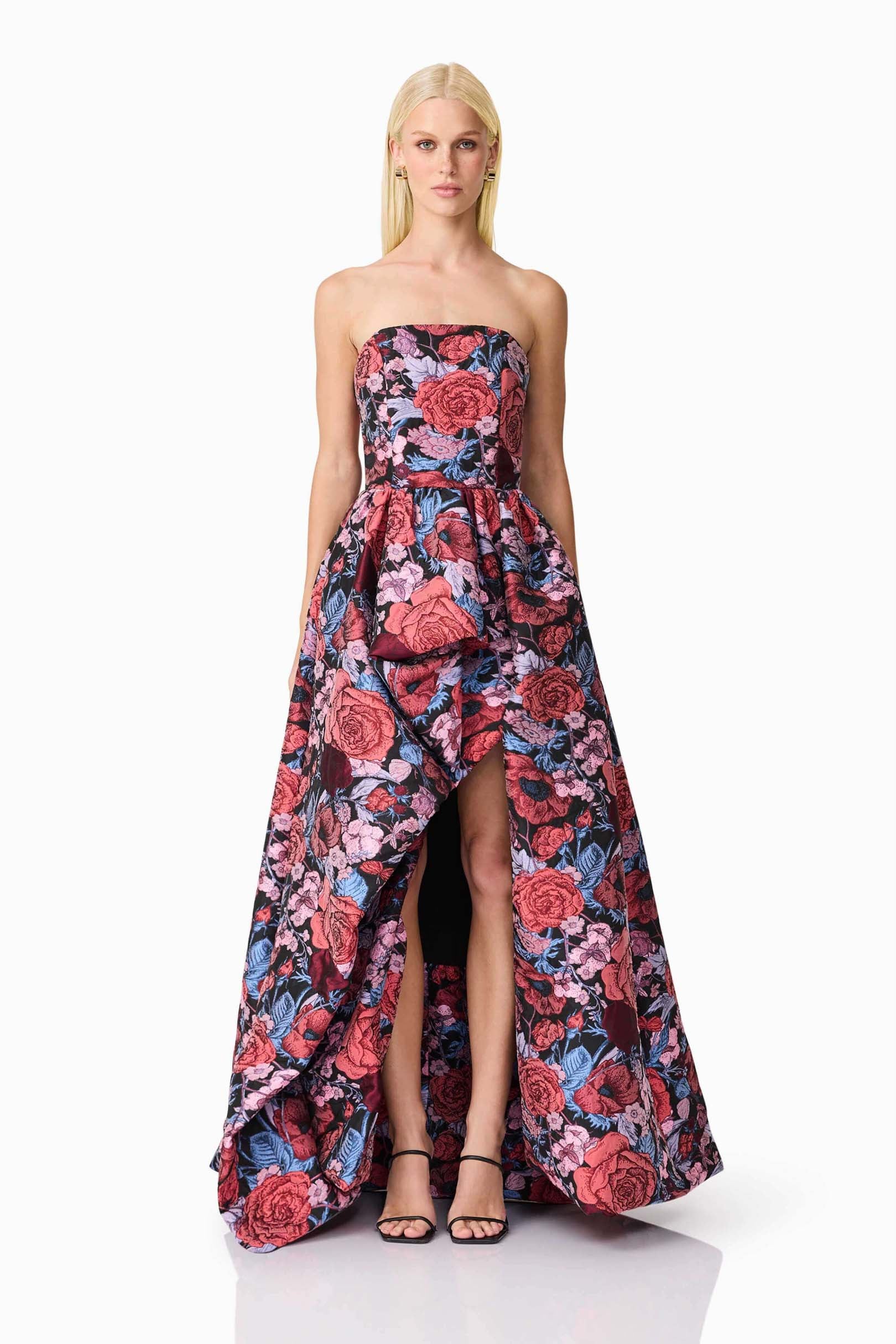 Step into timeless elegance with the Delphine Strapless Gown in Pink & Black Floral. Crafted from stretch embellished mesh, this striking eventwear gown is designed to contour the body while showcasing delicate floral artistry. The strapless bodice features a dramatic plunging V neckline, sculpting the décolletage for a confident, feminine silhouette that balances boldness with refinement.