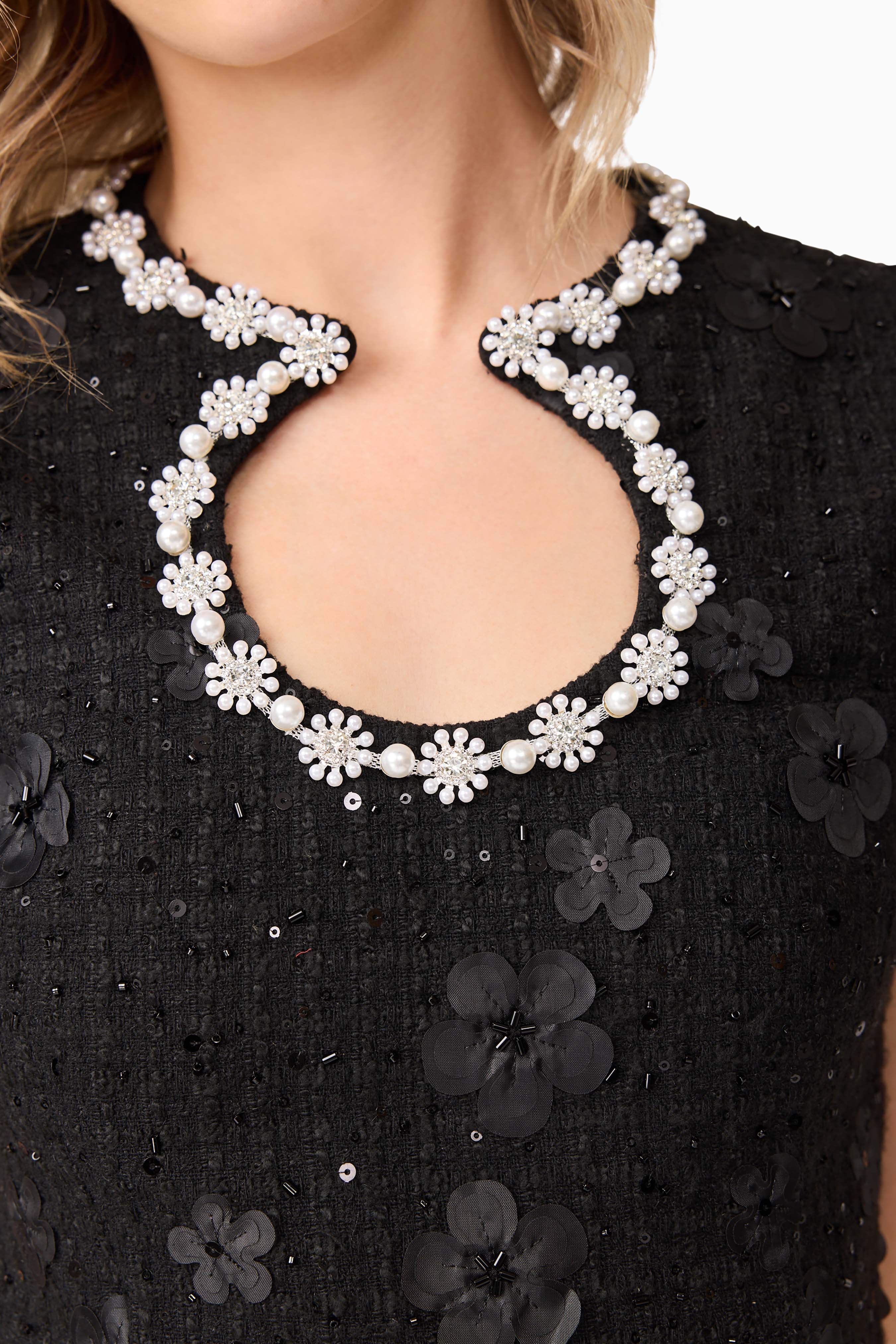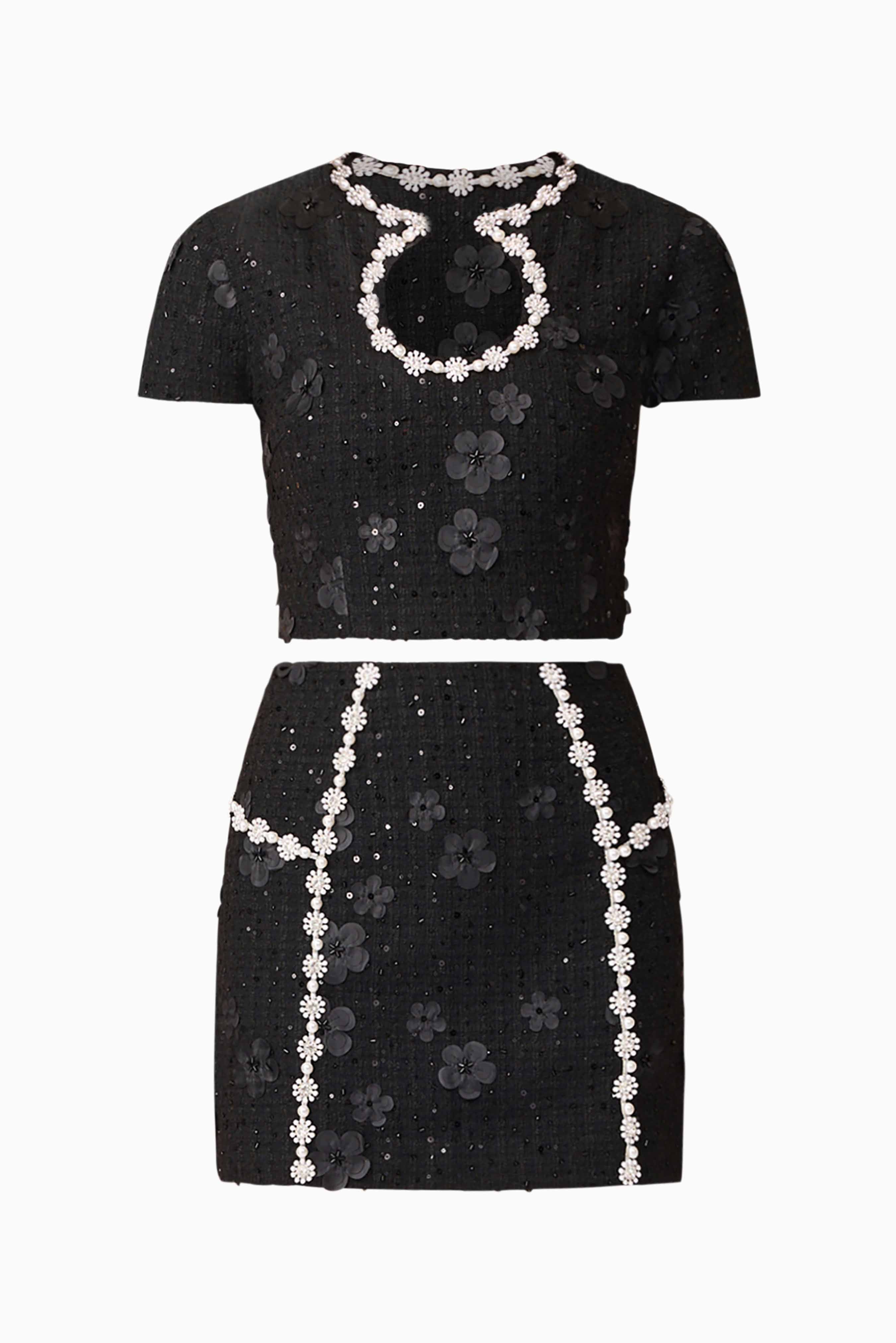 The matching skirt completes the look with coordinating texture and tailored fit, offering versatility to wear together or as separates. Whether styled with heels for a polished evening outfit or dressed down with flats for a smart casual look, the Ellouise Embellished Tweed Set in Black is your go-to for effortless style and sophistication.