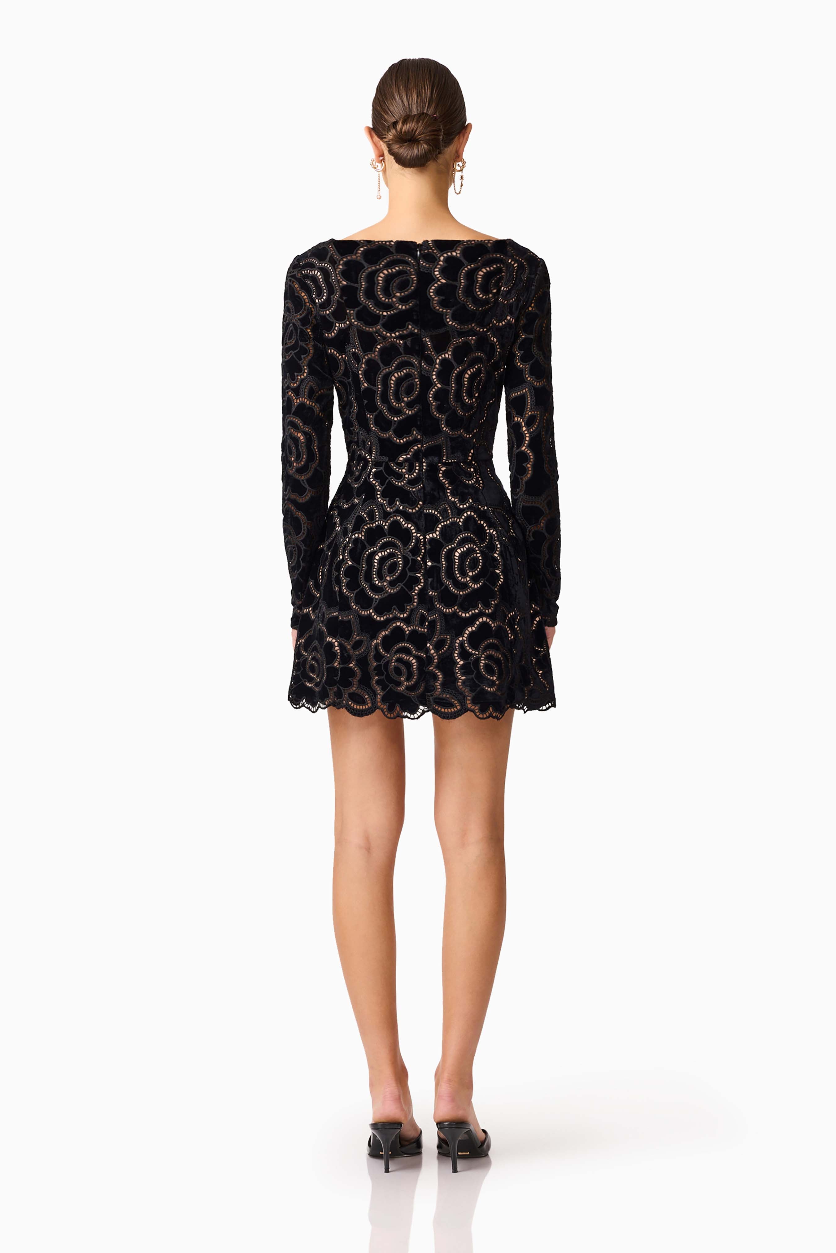 Romantic and refined, the Eris Long Sleeve Mini Dress in Black is designed to leave an impression. This velvet lace long sleeve mini dress is all about texture and structure, crafted from delicate floral velvet fabrication with a sculpted fitted silhouette that flatters effortlessly.