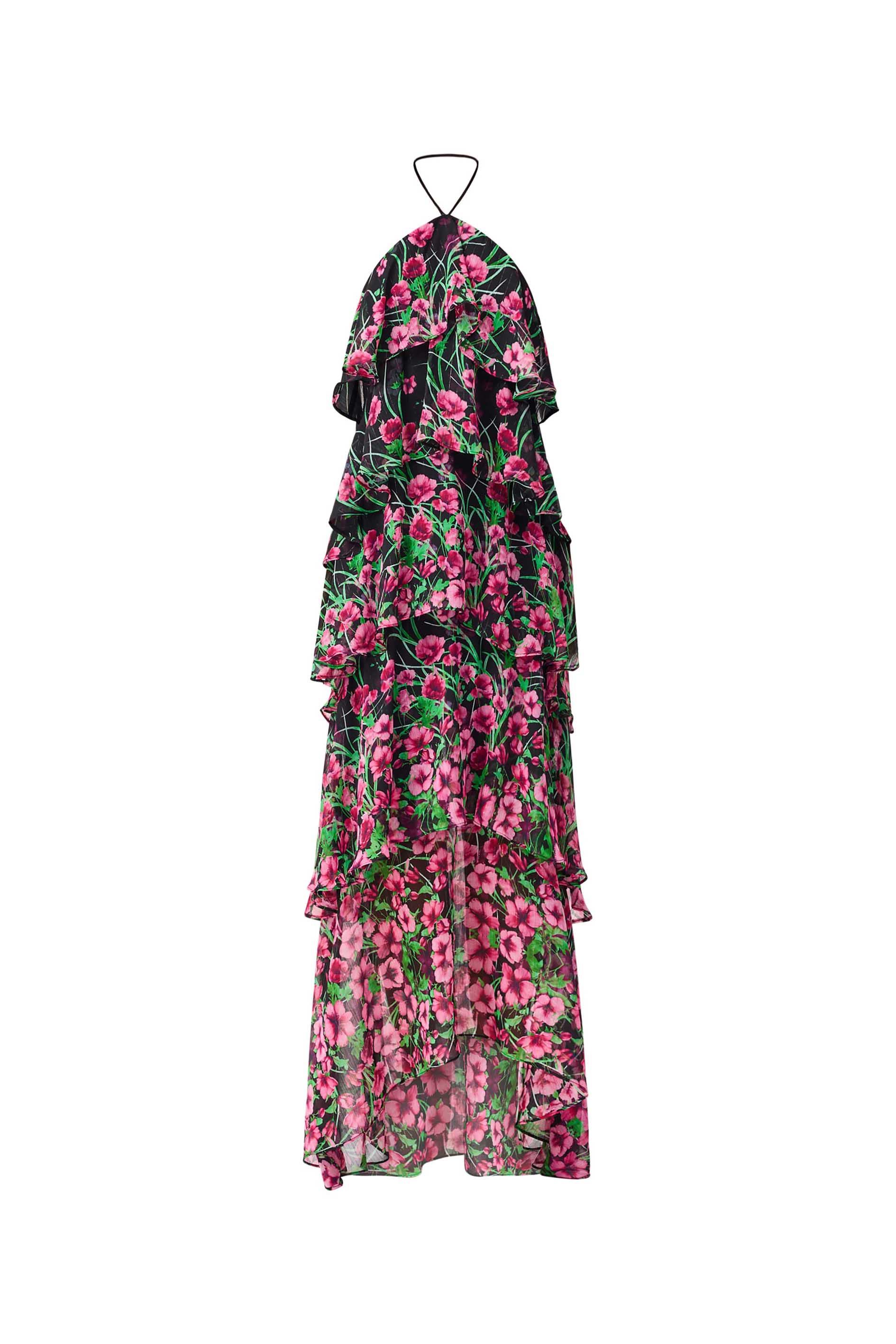 The Estelle Halter Gown in Black & Pink Floral is the epitome of romantic elegance, crafted in a flowing printed georgette fabrication. This beautifully detailed dress features a halter neckline that flatters the shoulders and elongates the neck, making it perfect for formal events, weddings, or evening functions.