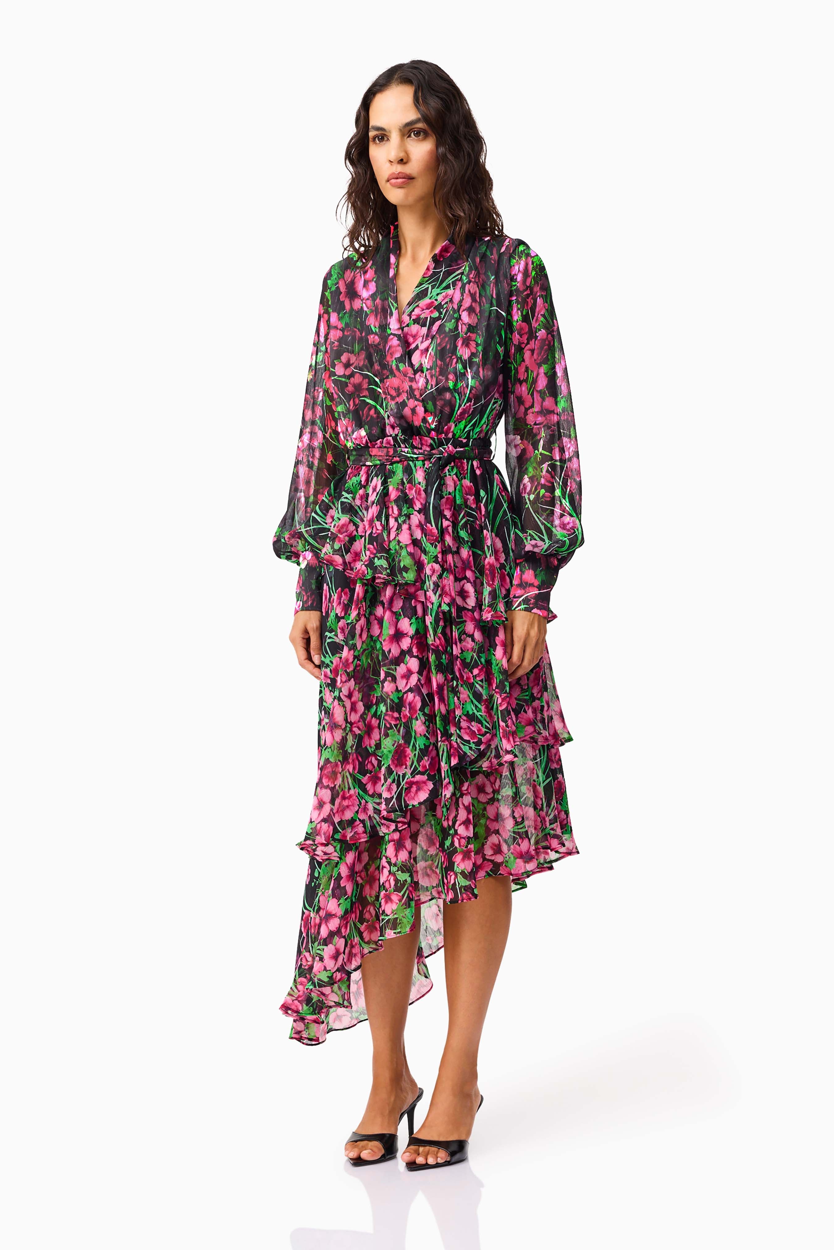 The Estelle Long Sleeve Maxi Dress in Black & Pink Floral brings romantic ease to eventwear dressing. Crafted from delicate printed georgette fabrication, this piece moves effortlessly with you, while a V-neckline adds a flattering focal point.