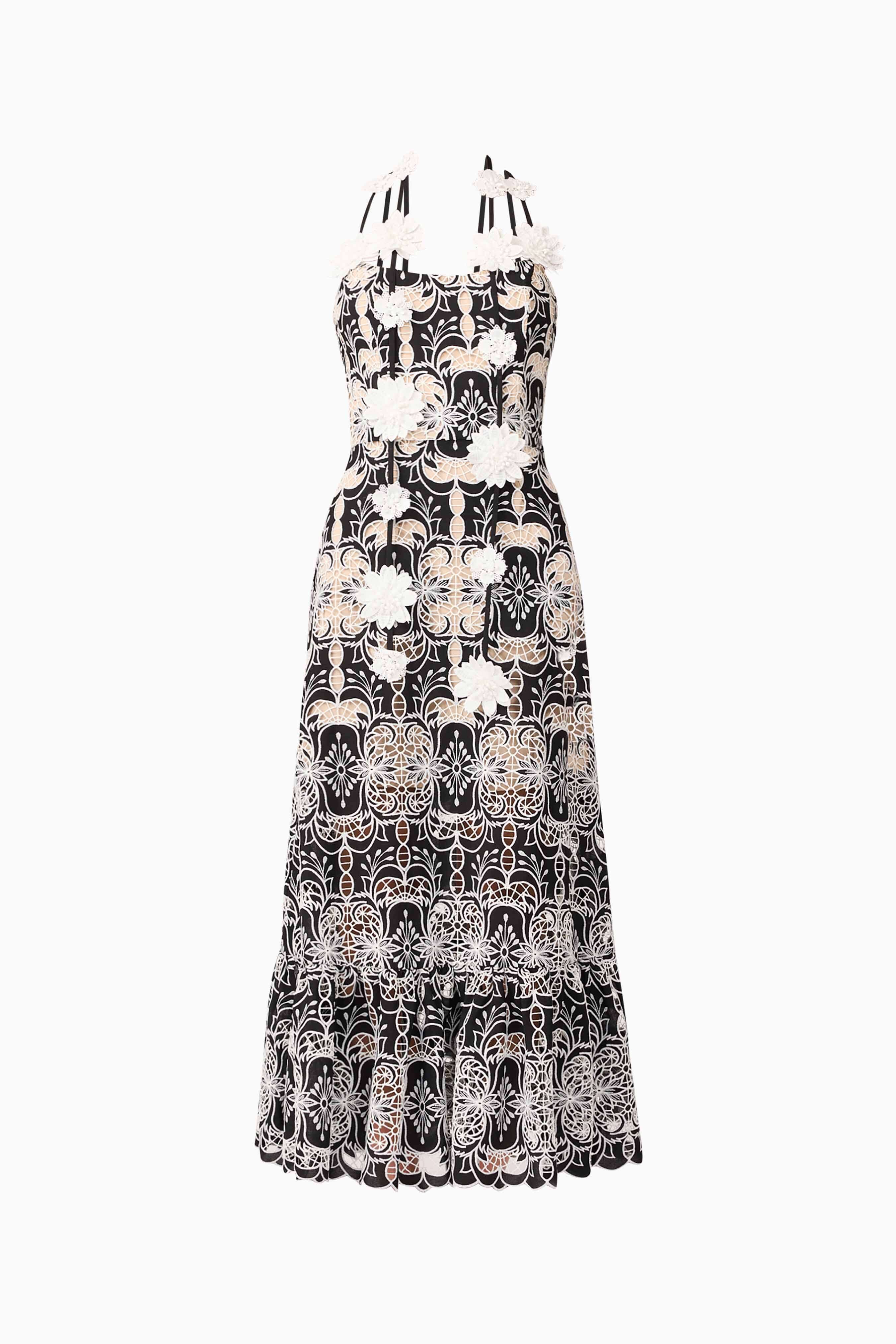 The Jolie Floral Midi Dress in Black is an elevated take on romantic occasion wear. Crafted from a luxe monochrome embroidered crepe fabrication, this A-line midi dress features intricate floral embroidery in crisp white, layered over a rich black base for a striking contrast.