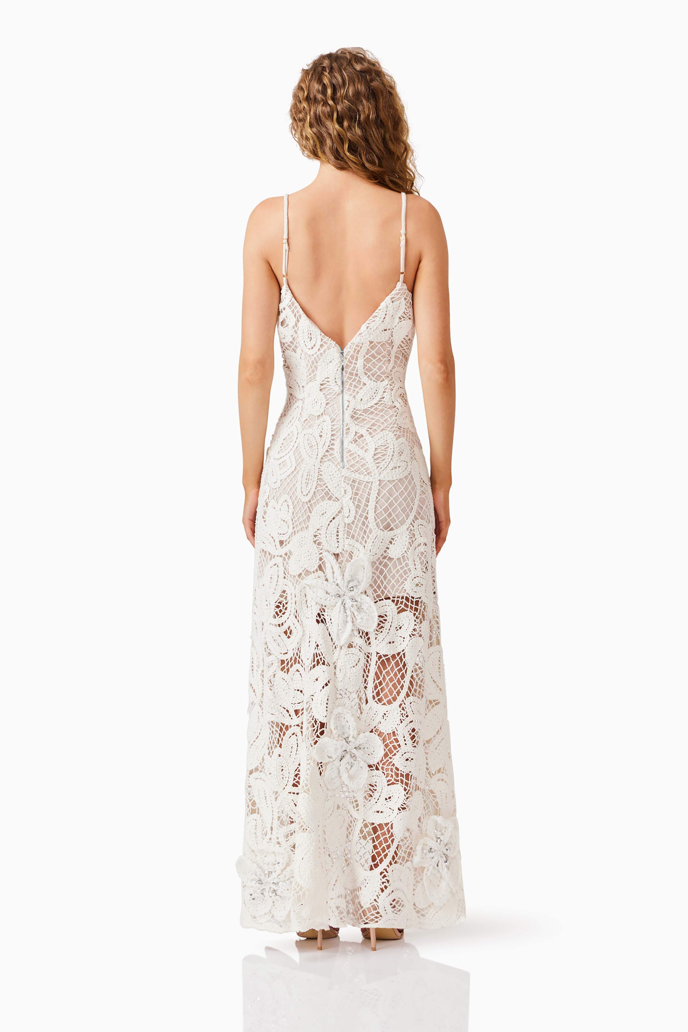 The Kyra Crochet Gown in White is a stunning combination of delicate crochet work and modern design elements, making it the perfect choice for special occasions. This gown features an intricate crocheted floral design, with 3D flowers accented by small sequins and diamante for a touch of sparkle and elegance. The lightweight fabric and the intricate crochet detailing create a flattering, feminine silhouette that exudes sophistication.