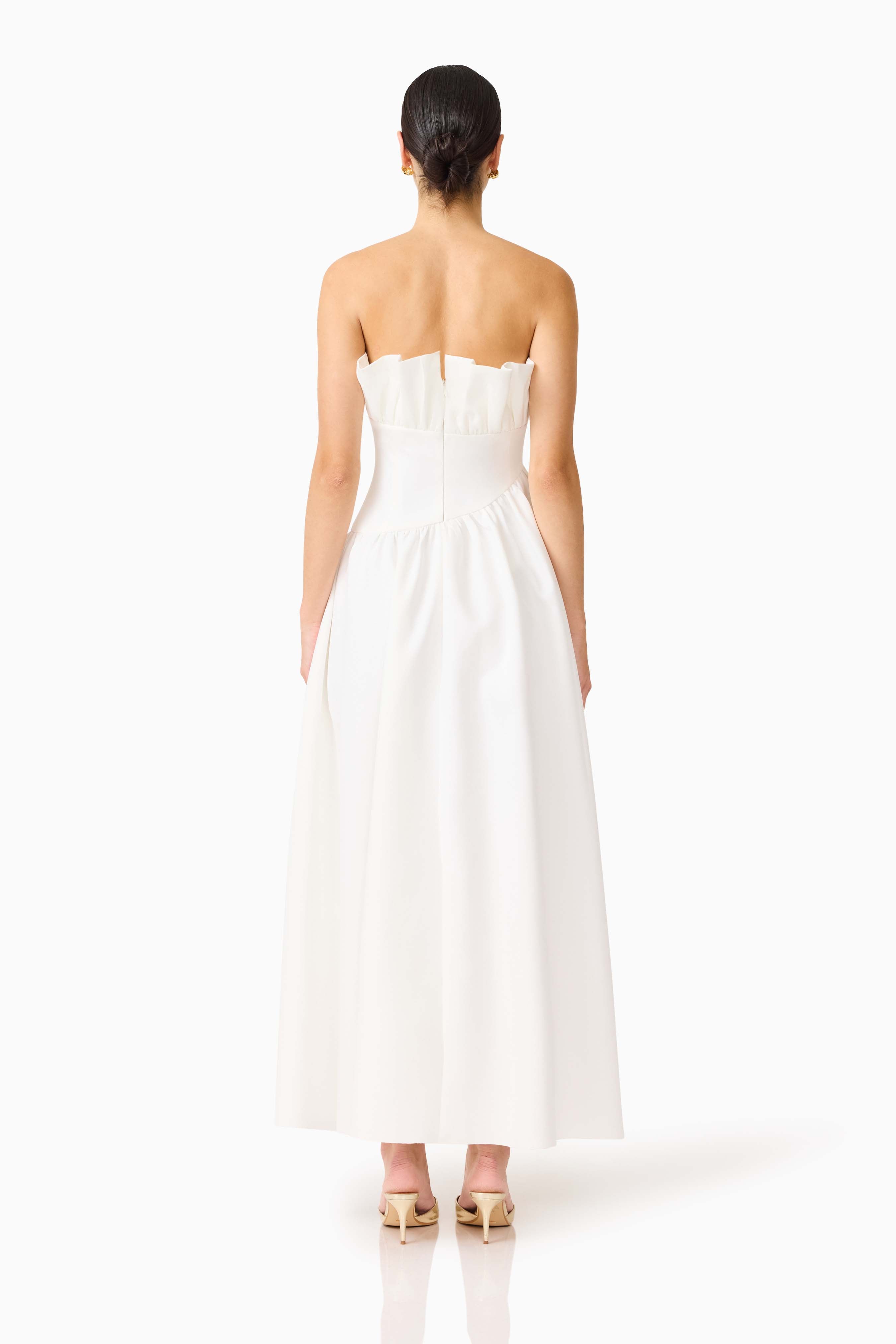 Timeless elegance meets modern design in the Laurel Sleeveless Maxi Dress in White. Crafted with a flattering A-line silhouette, this floor-length gown flows effortlessly, making it ideal for bridal events, formal occasions, or summer evenings. The structured ruffle detail at the bust adds a touch of romance, offering shape and visual interest without overwhelming the design.