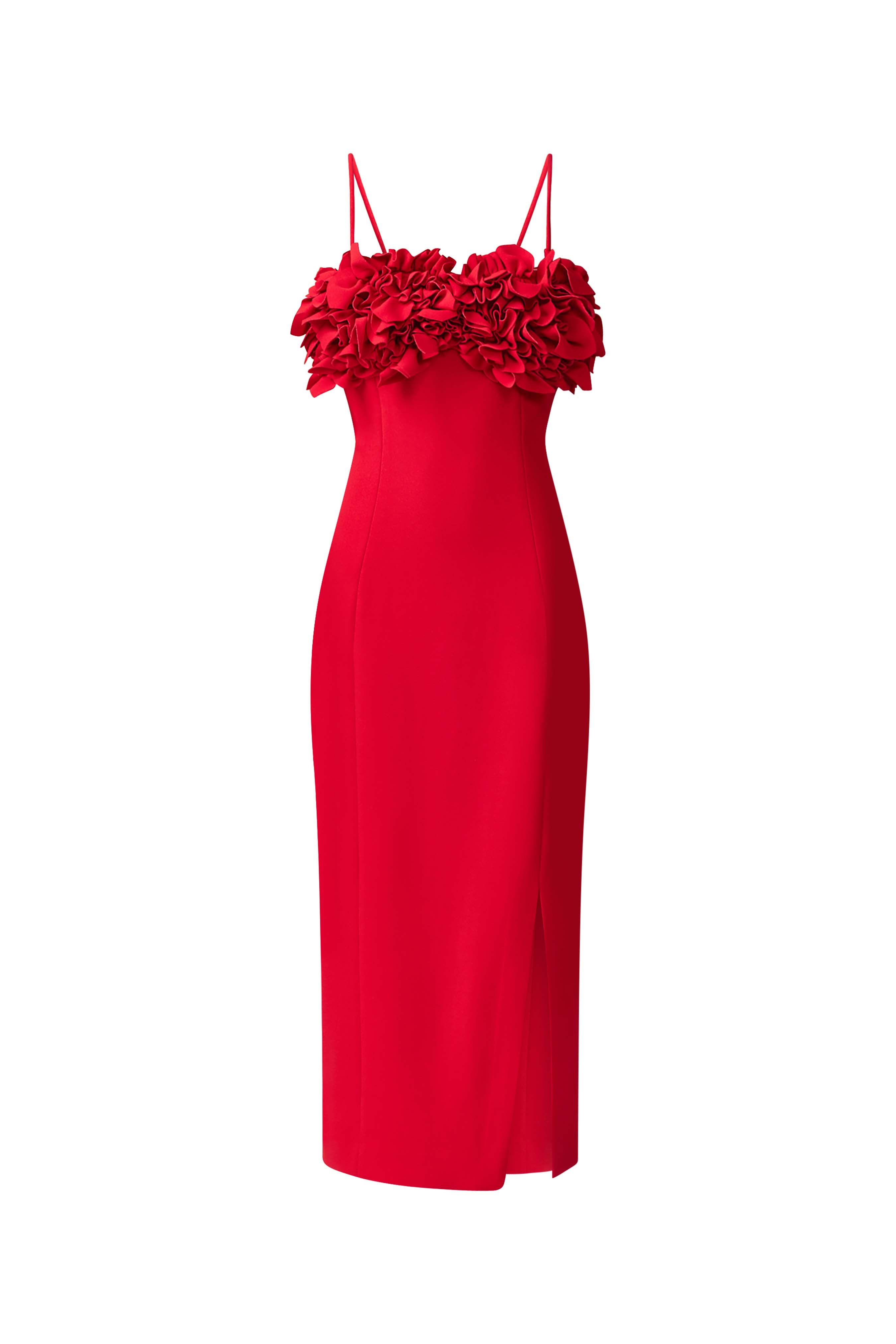 Sophisticated with a romantic twist, the Lila Fitted Midi Dress in Red is made to stand out. Designed in a smooth stretch crepe fabrication with a body-hugging fitted silhouette, this midi dress brings modern elegance and sculpted form to your next special event.