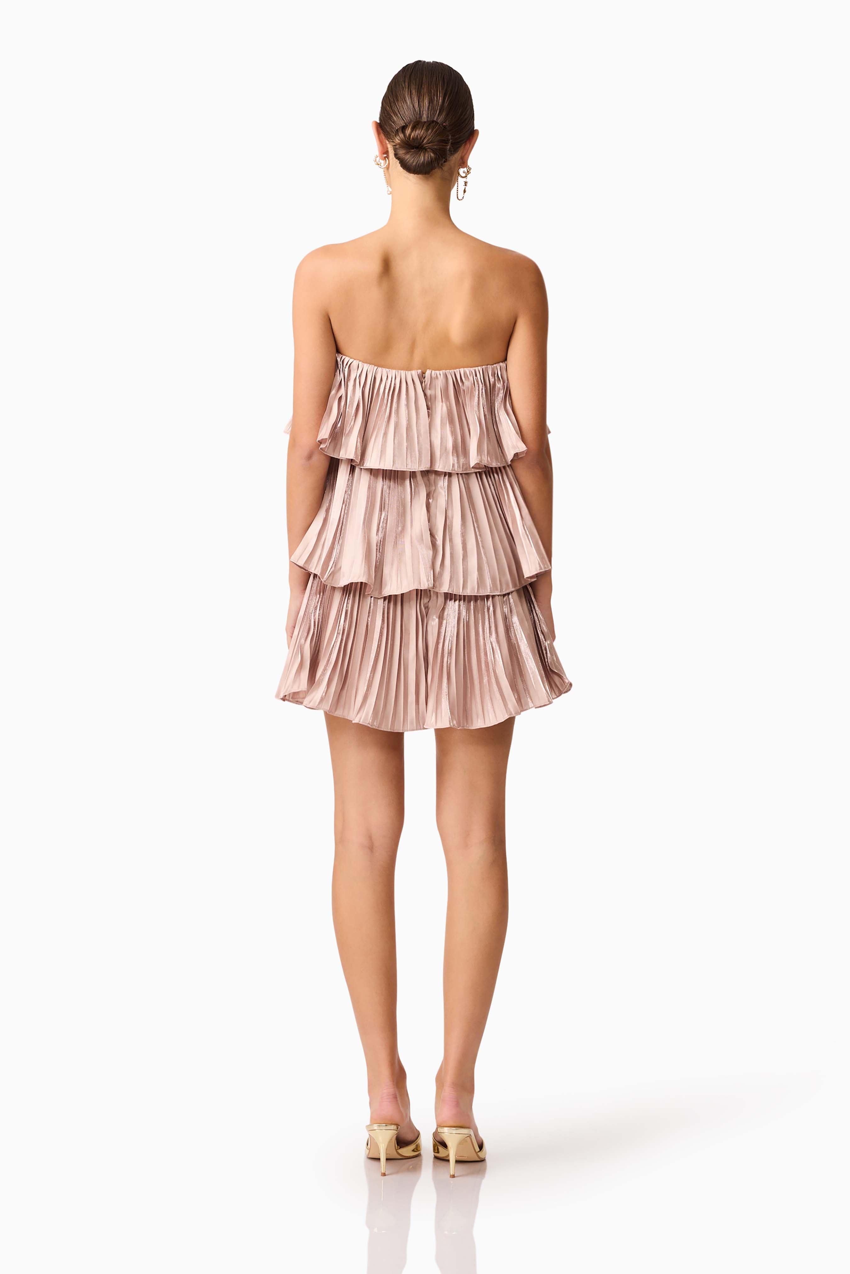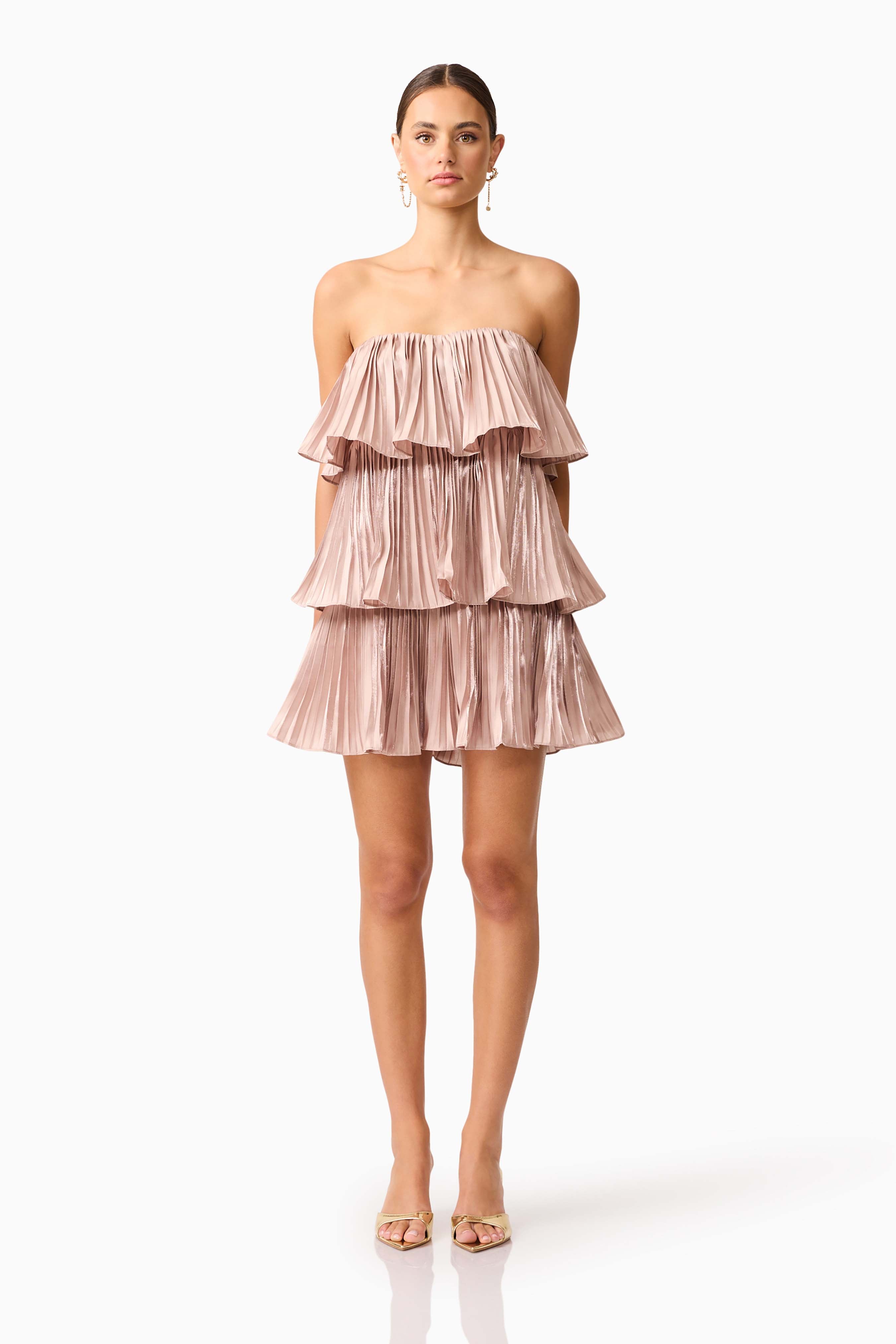 Romantic and radiant, the Lison Tiered Strapless Mini Dress in Pink is your go-to choice for standout summer events or cocktail evenings. This strapless tiered mini dress comes in a dreamy rose gold hue with a shimmering pleated fabrication that catches the light beautifully, giving you a soft, ethereal glow. Its relaxed fit and tiered layers create graceful movement, perfect for dancing the night away or making an entrance at your next wedding guest event.