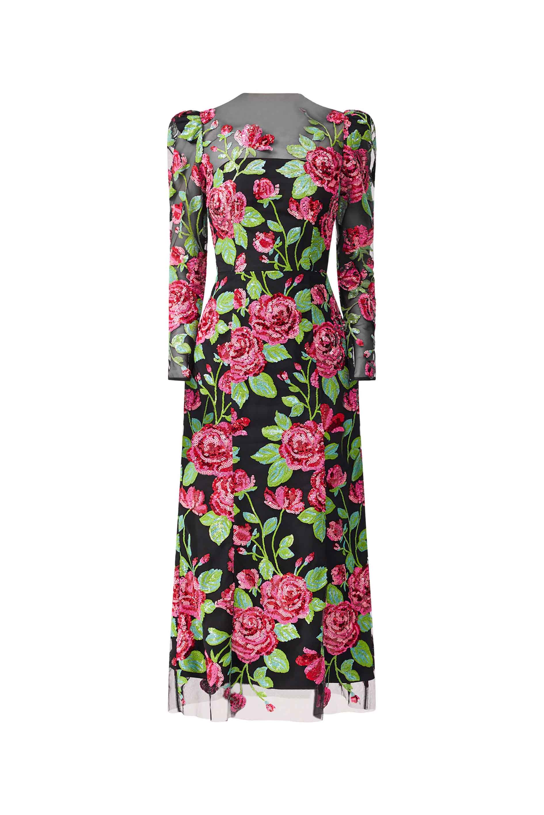 The dress is fully lined for a smooth, seamless finish, while a centre back exposed zipper adds a touch of modern detail and makes for easy dressing. The combination of black and pink florals over shimmering mesh creates a bold yet elegant contrast that’s sure to turn heads.