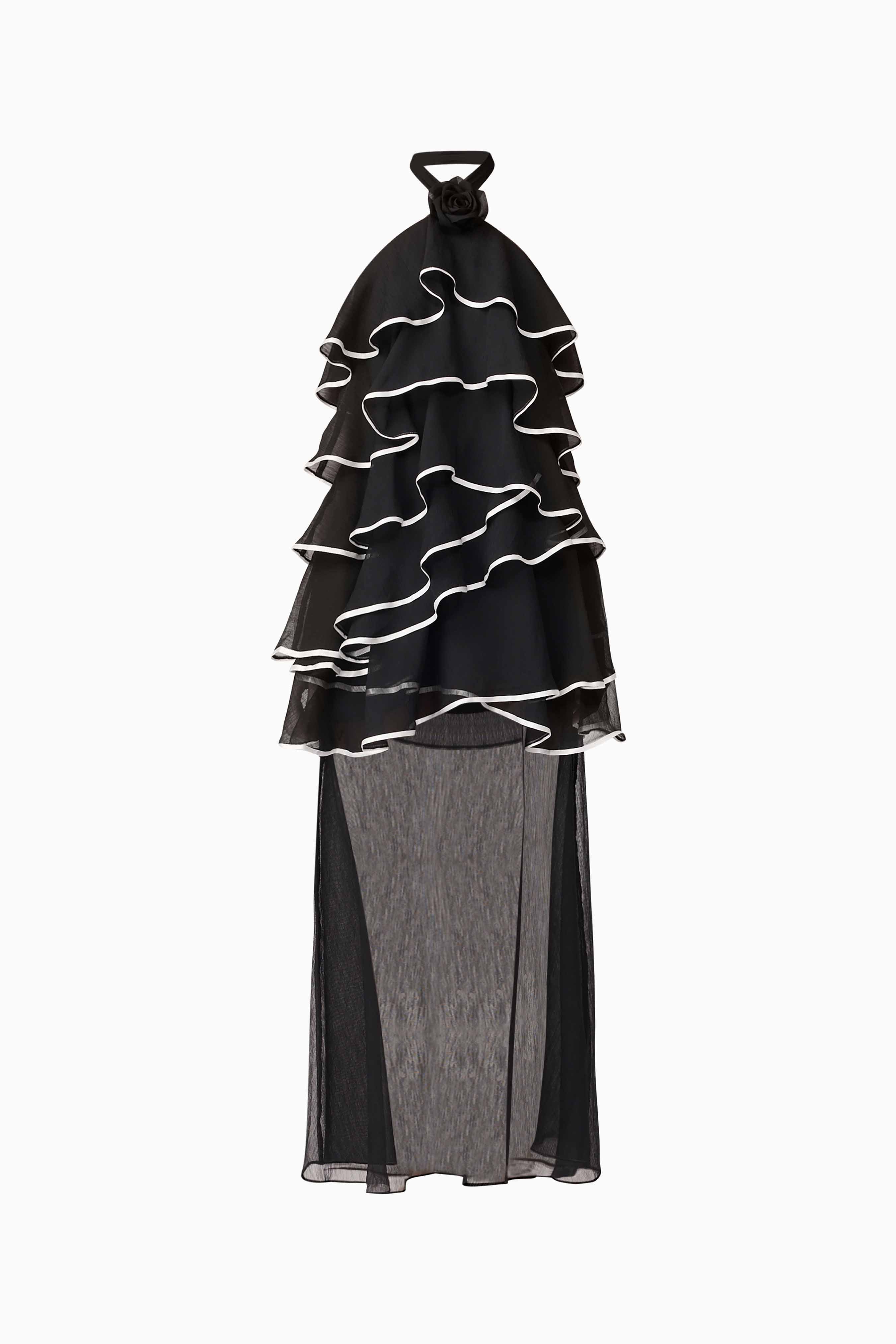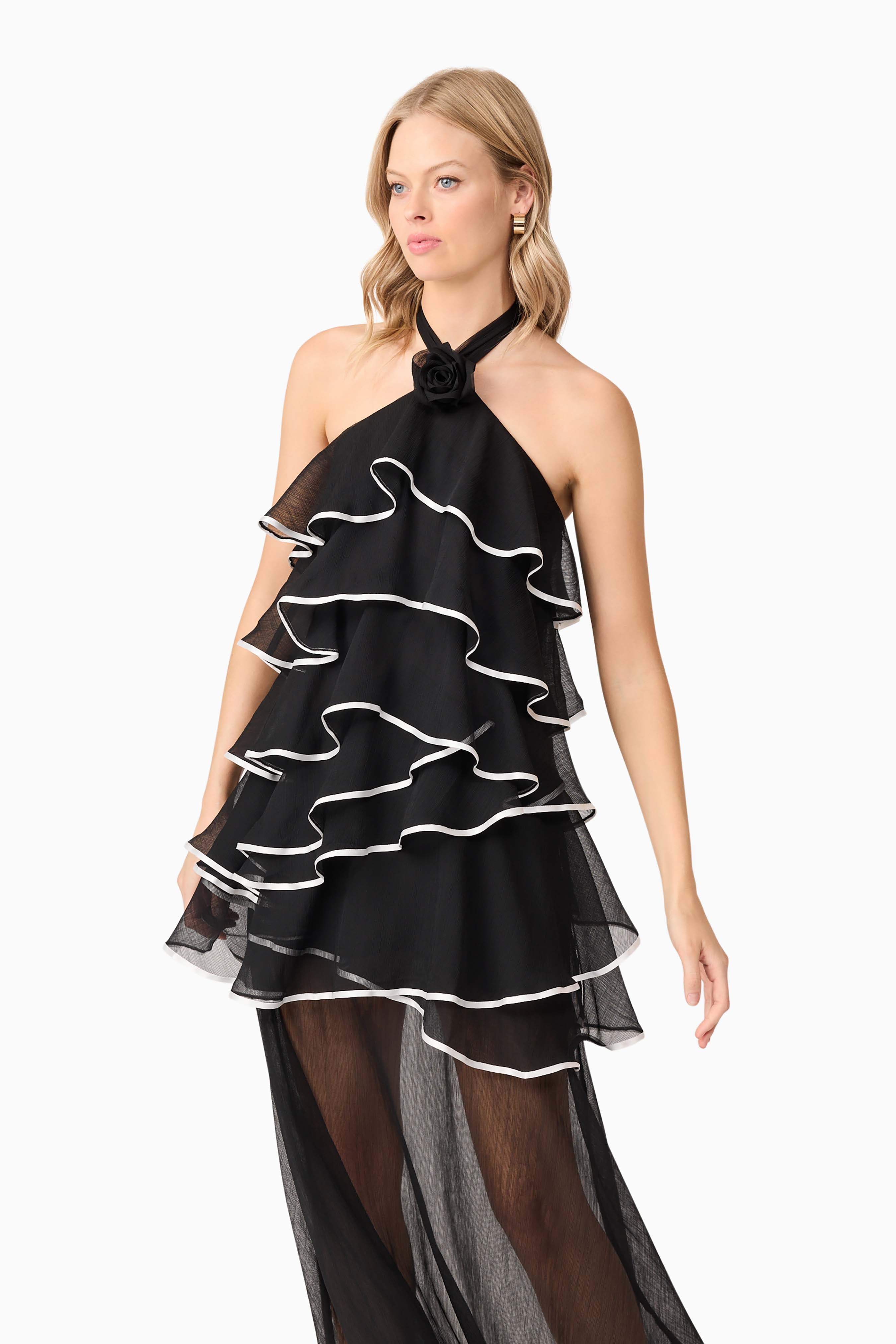 Make a statement in the Melissa Halter Maxi Dress in timeless black. Designed with a sophisticated halter neckline, this dress beautifully frames the shoulders and neck, creating an effortlessly elegant look. The cascading tiered frills with satin trim add movement and texture, bringing a touch of drama to the flowing silhouette.