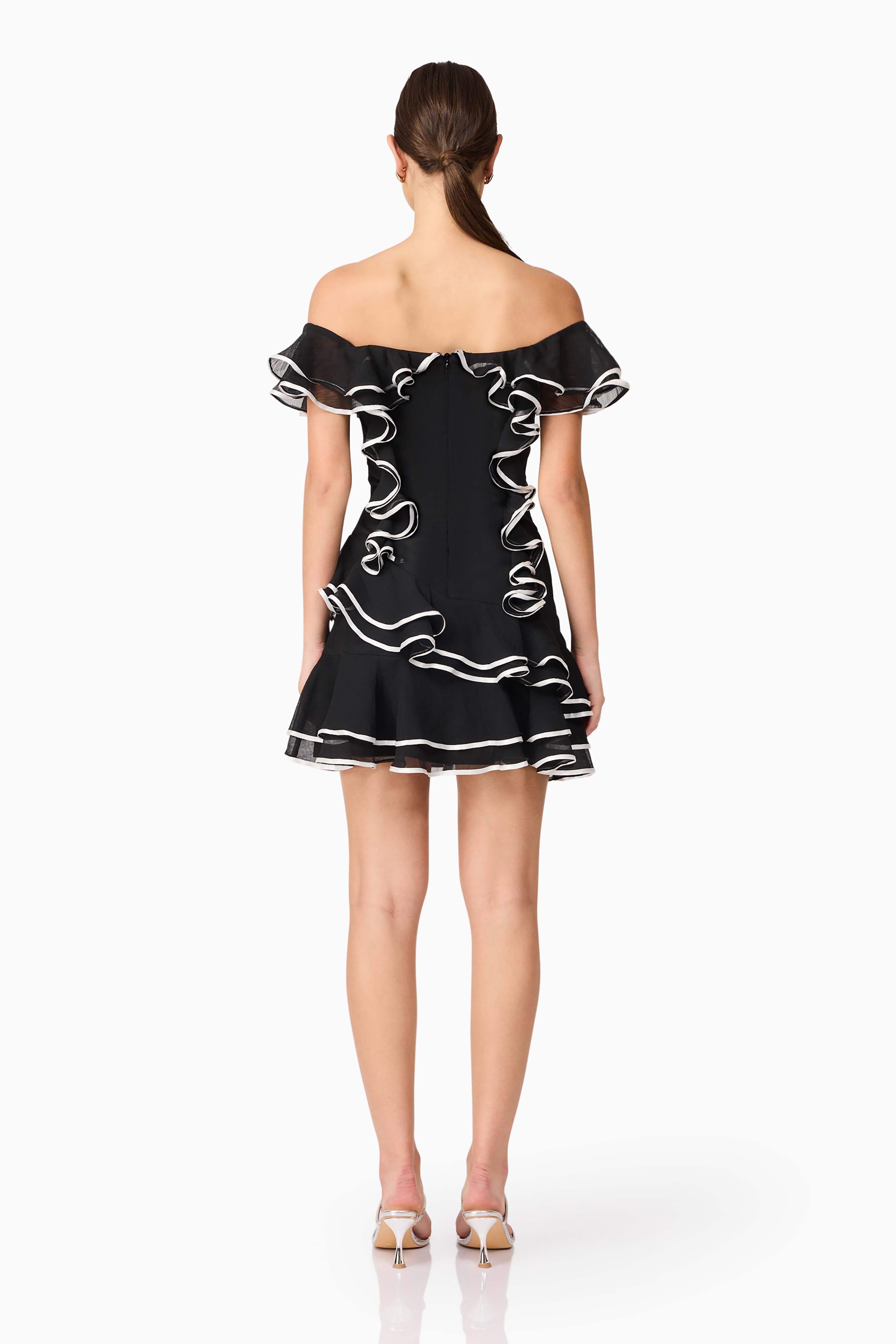 The cascading tiered frills bring a playful edge while adding volume and graceful movement to the look, making each step feel like a statement. The mini length keeps it flirty and modern, while the black hue ensures it remains versatile and easy to accessorise.