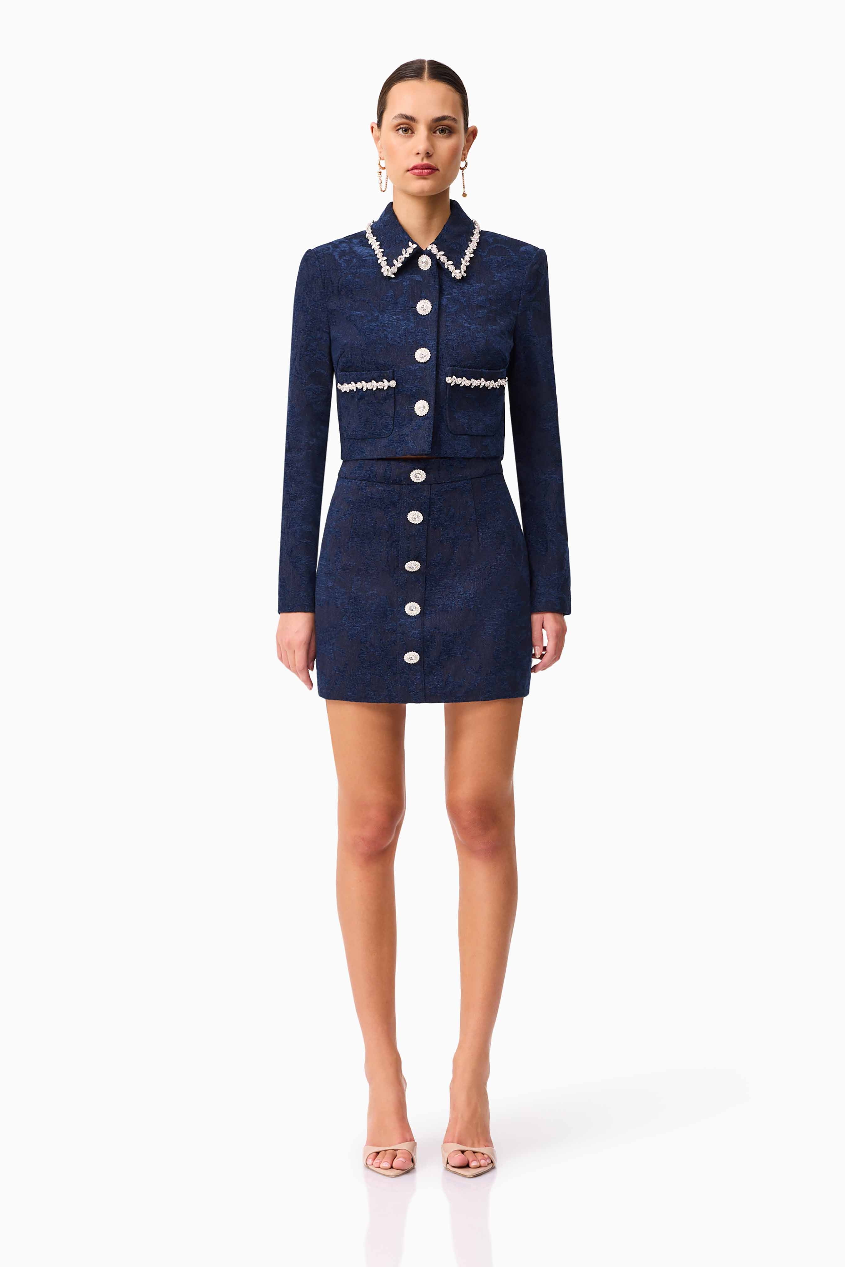 Refined with a playful edge, the Melody Jacquard Top & Skirt Set in Blue delivers a polished denim-inspired look perfect for elevated daywear or after-dark styling. The long sleeve top features a collared neckline and centre front buttons, subtly accented with a shimmering diamanté trim for a touch of glamour. Crafted from denim jacquard fabrication with a structured, regular fit, the top is fully lined for a premium feel.