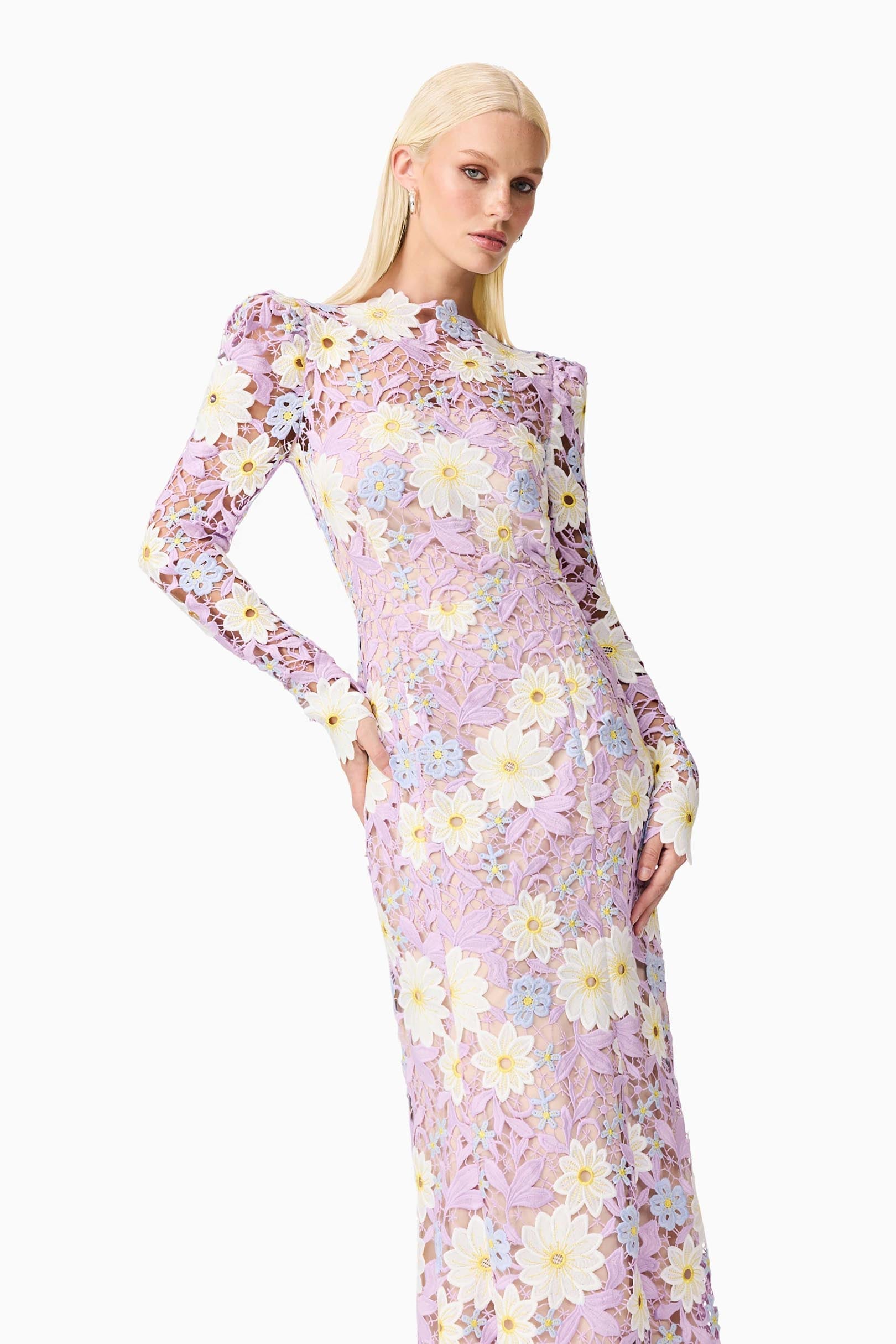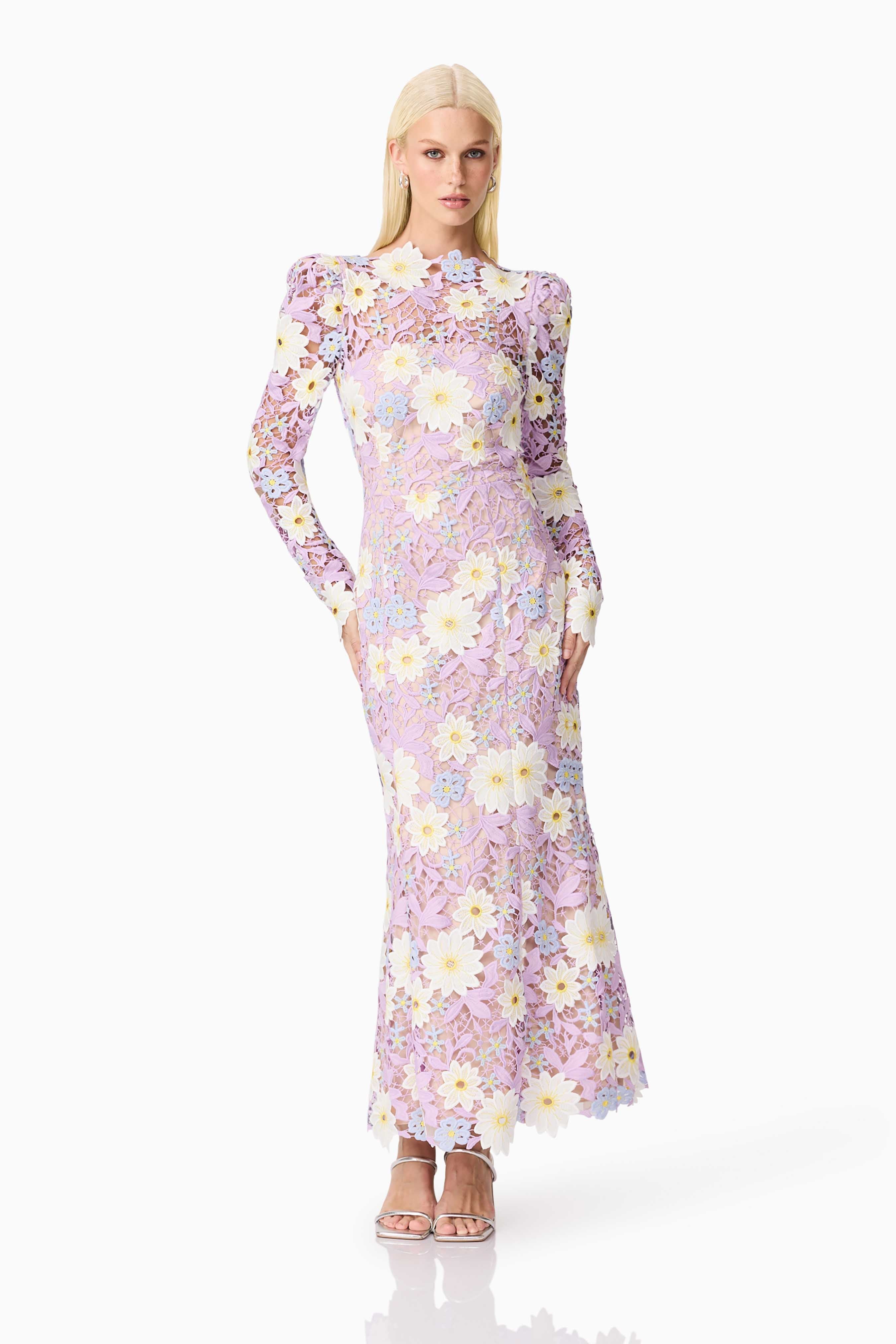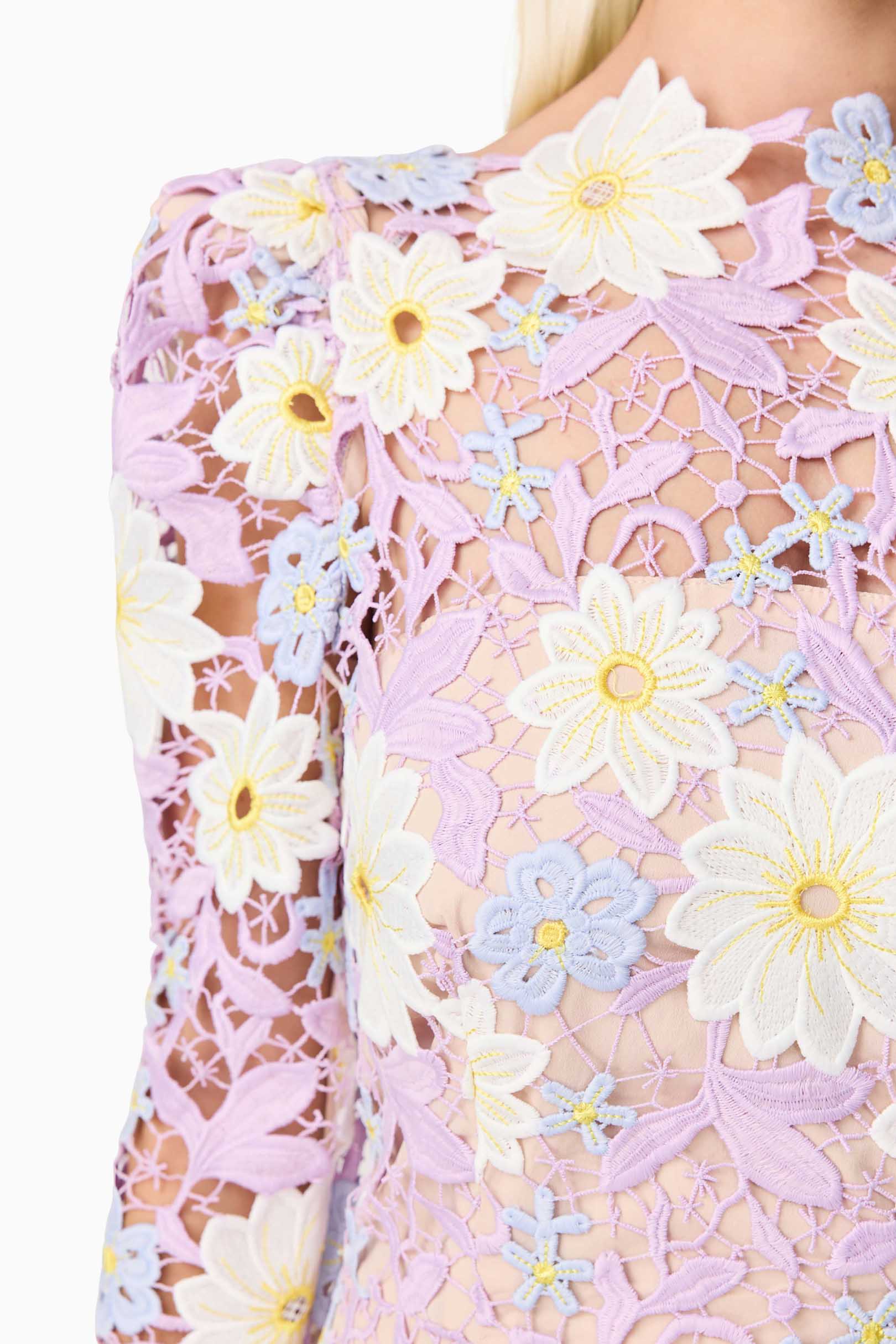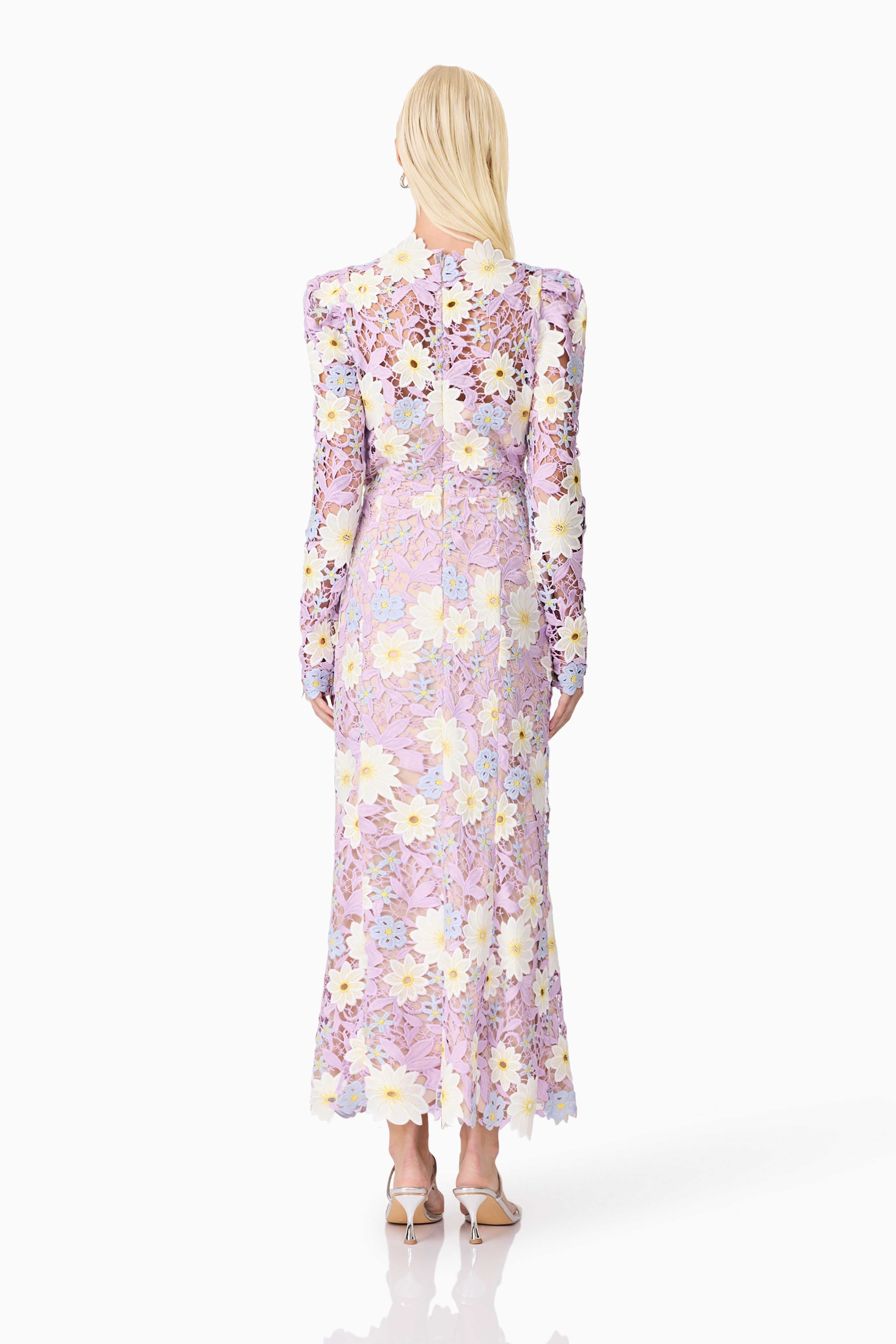 The Sigrid Long Sleeve Midi Dress in Purple is a refined expression of modern romance and elegance. Worn by our blonde model, this fit-and-flare long sleeve midi dress is crafted from intricate guipure lace fabrication, offering rich texture and a timeless feel.