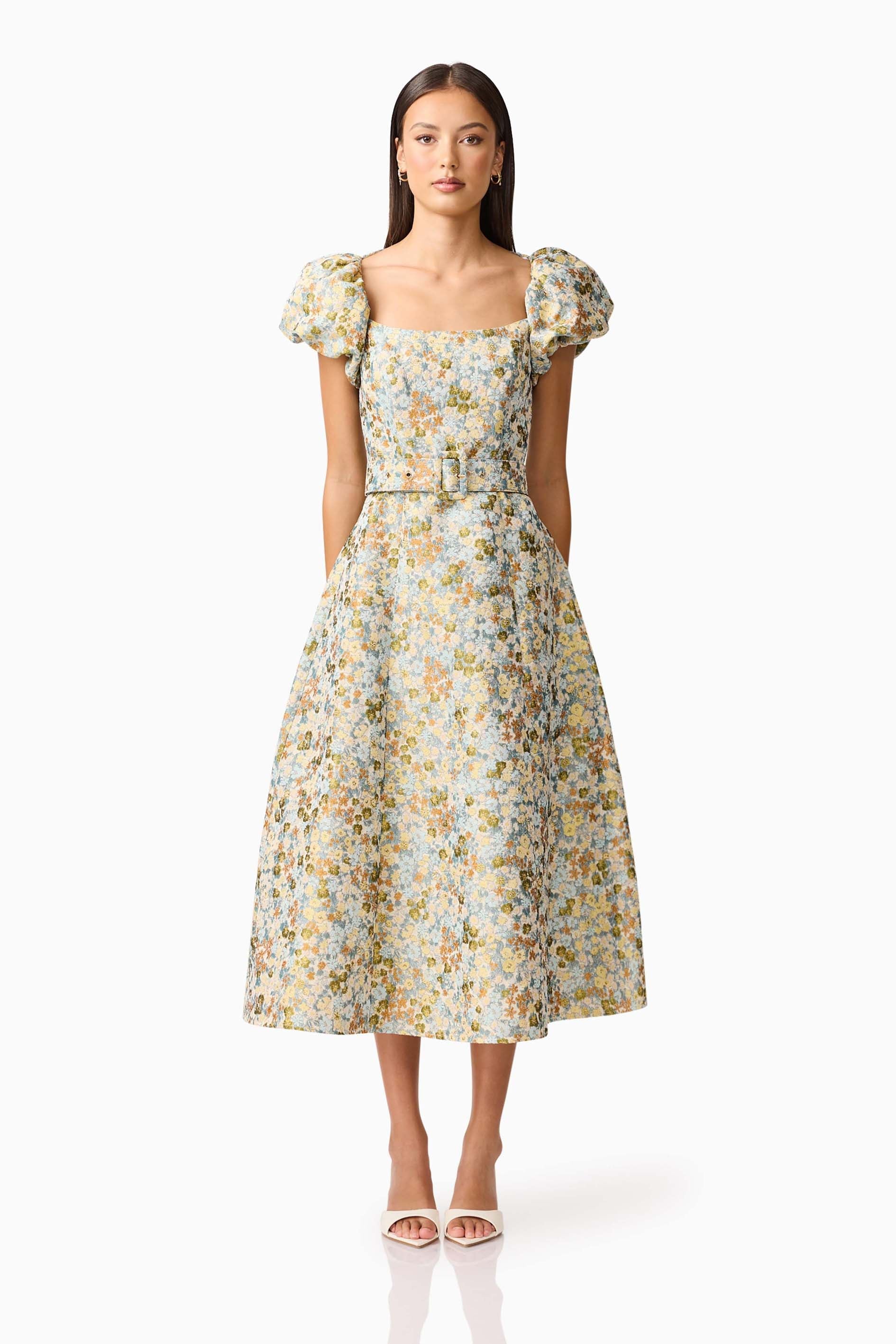 Brighten any occasion with the Tasmin Puff Sleeve Midi Dress in Blue & Yellow Floral, a standout piece designed to celebrate bold femininity. Crafted from premium jacquard fabrication, this midi dress showcases a striking blue and yellow floral pattern that feels fresh, vibrant, and full of life.