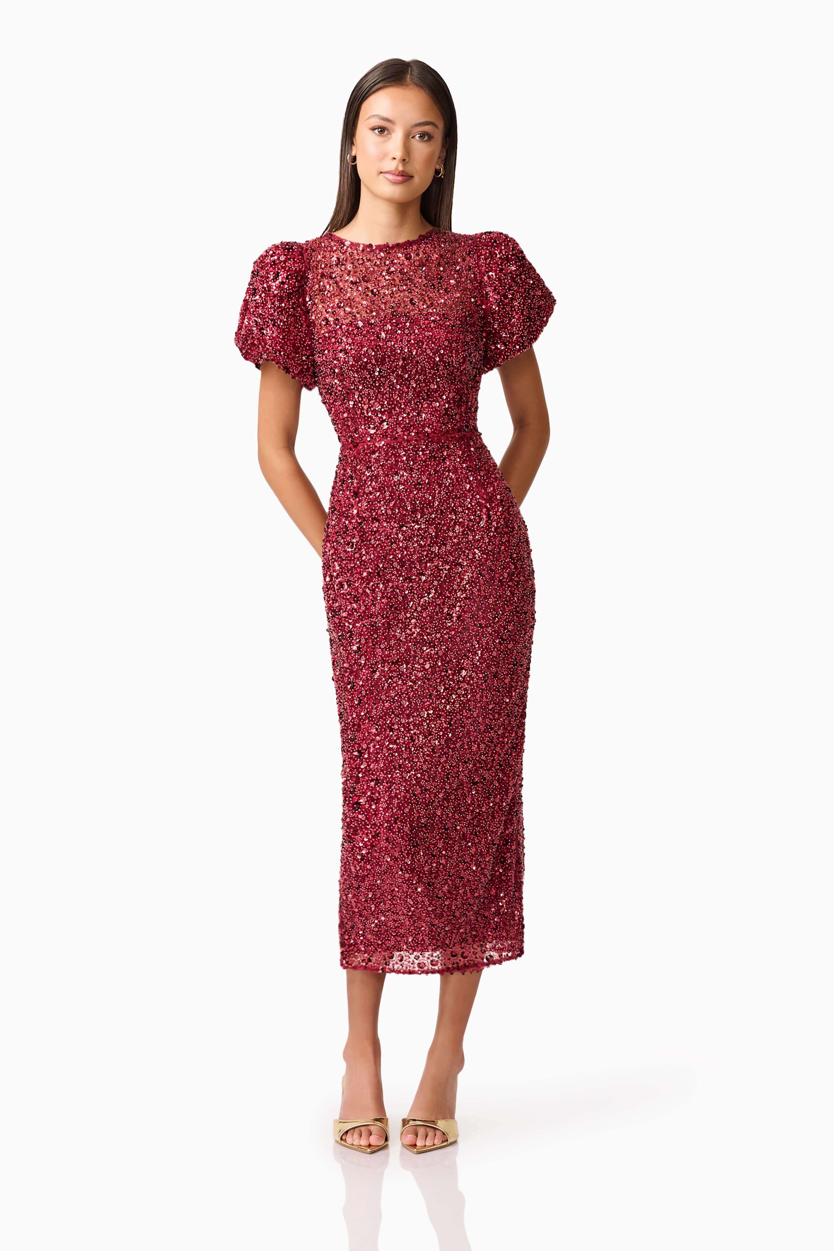 Elegant with a touch of drama, the Carmen Puff Sleeve Midi Dress in Red is a standout piece for special occasions. Crafted from a soft beaded mesh fabrication, it offers subtle shimmer and intricate texture that elevates its timeless silhouette.
