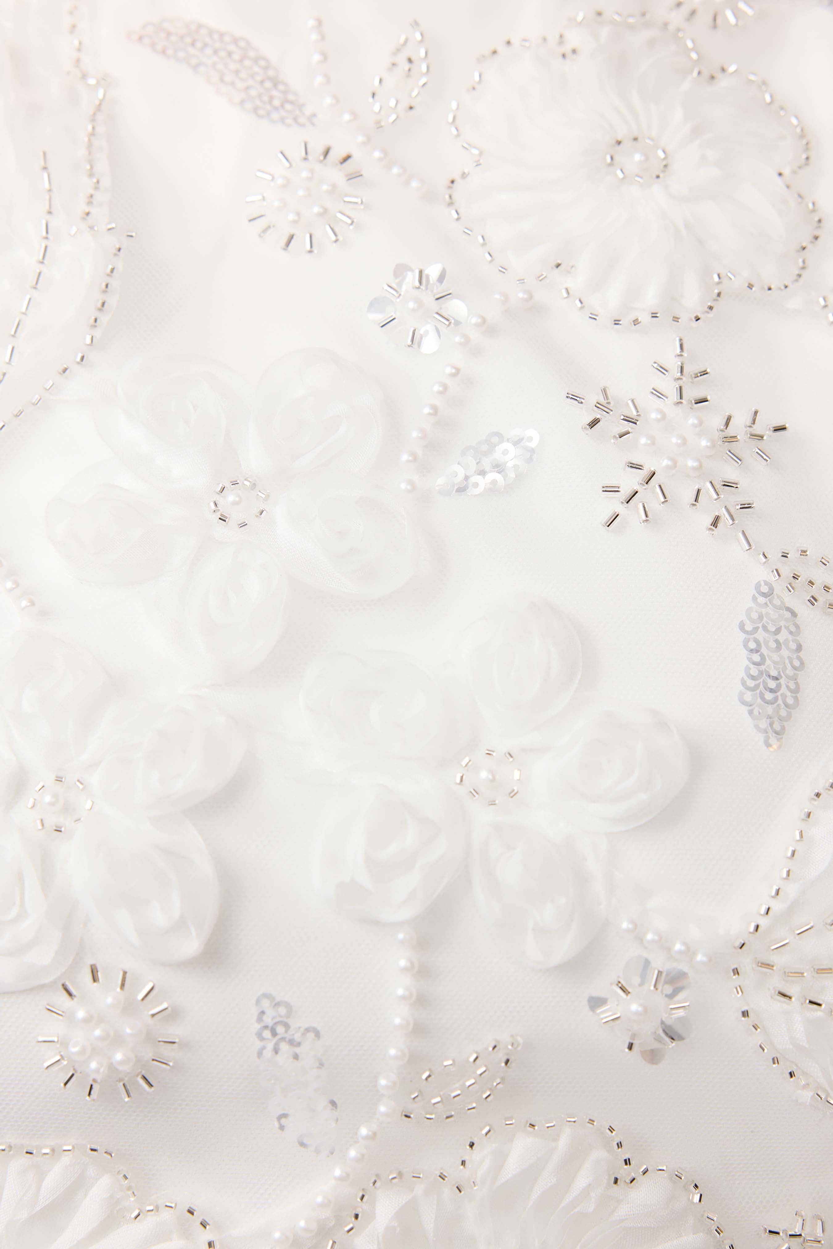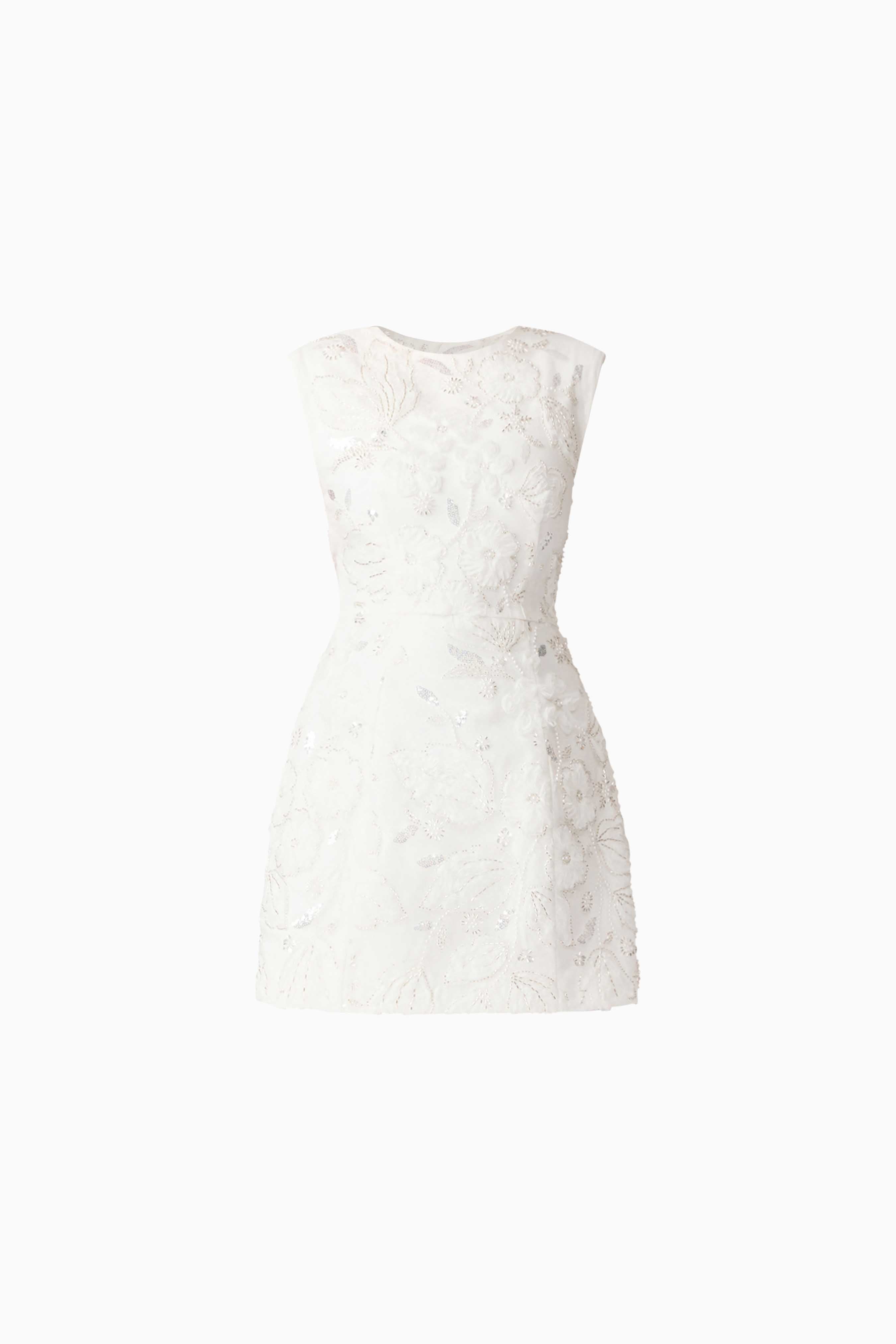 The fitted bodice features intricate floral embroidery and tonal embellishment, adding dimension and texture to the all-white palette. The skirt features a soft tulip shape that skims the body—blending feminine curves with tailored structure. Fully lined for comfort and coverage, the dress maintains its crisp shape throughout wear.