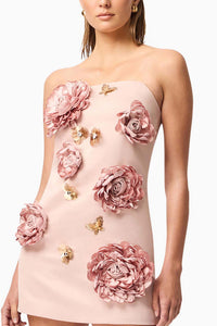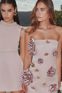 The Camile Mini Dress showcases sophisticated design with its champagne hue and intricate embellishment details. Removable and adjustable straps offer versatile styling options, allowing you to customize the fit for different occasions and preferences. The dress features exquisite 3D floral and butterfly appliques that create dimensional texture and visual interest throughout. These carefully placed embellishments elevate the piece from everyday wear to occasion-ready elegance. The mini silhouette provides a modern, flattering cut, while the ornate detailing ensures this dress makes a distinctive statement. Perfect for those seeking refined pieces that balance contemporary style with decorative artistry.