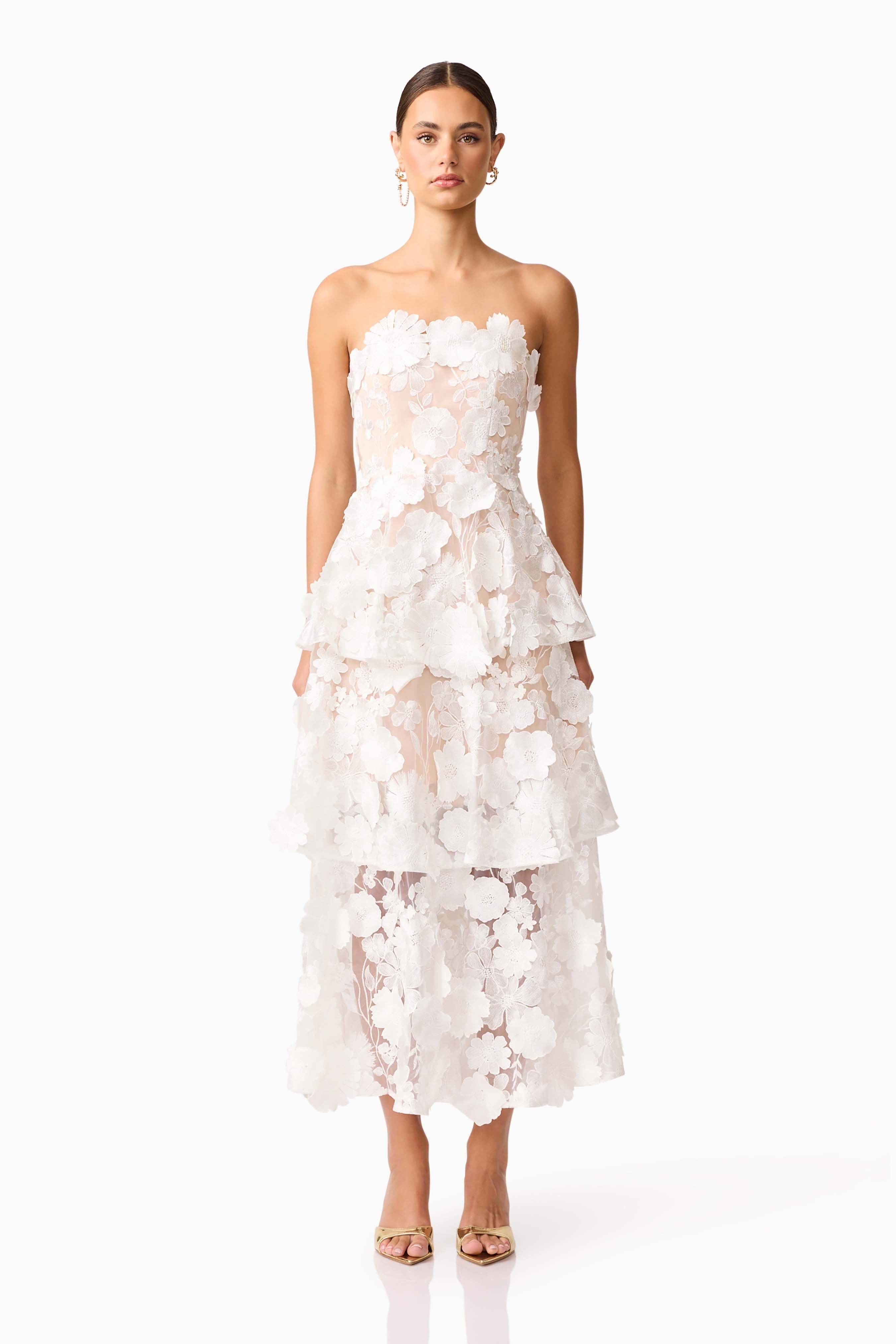 The Selene Maxi Tiered 3D Dress in White is a stunning blend of romance and sophistication. Designed for those special occasions, this strapless tiered maxi dress features an intricately fitted bodice that accentuates the figure. The removable, adjustable straps offer versatile styling options, allowing you to customise the fit to your liking.