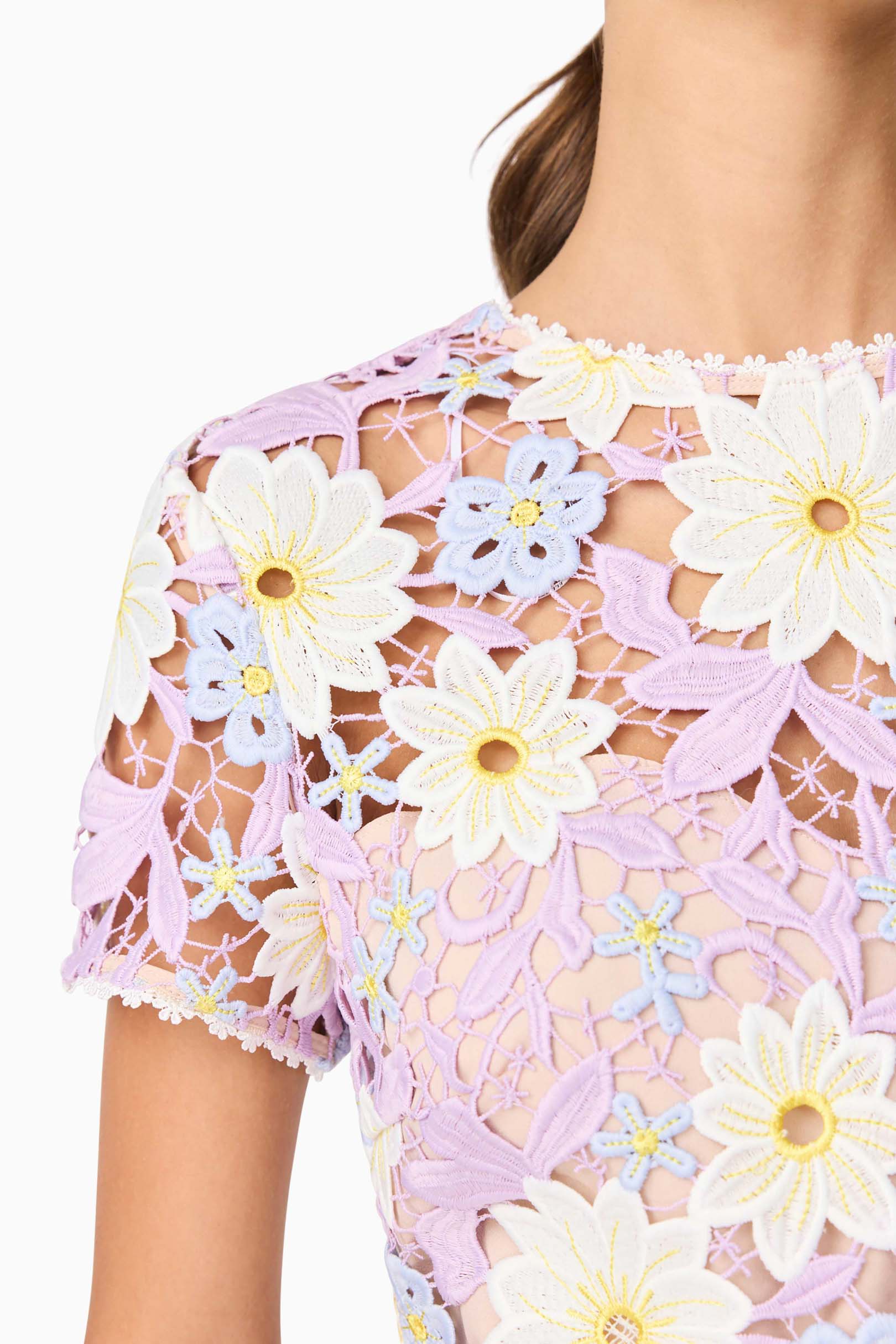 Made from luxurious guipure lace fabrication, the dress features delicate patterns that add texture and depth to its elegant design. The dress has short sleeves trimmed at the edges, providing subtle definition and balance to the silhouette. A feminine touch comes from the scalloped edge hemline, which softens the overall structure with graceful curves.
