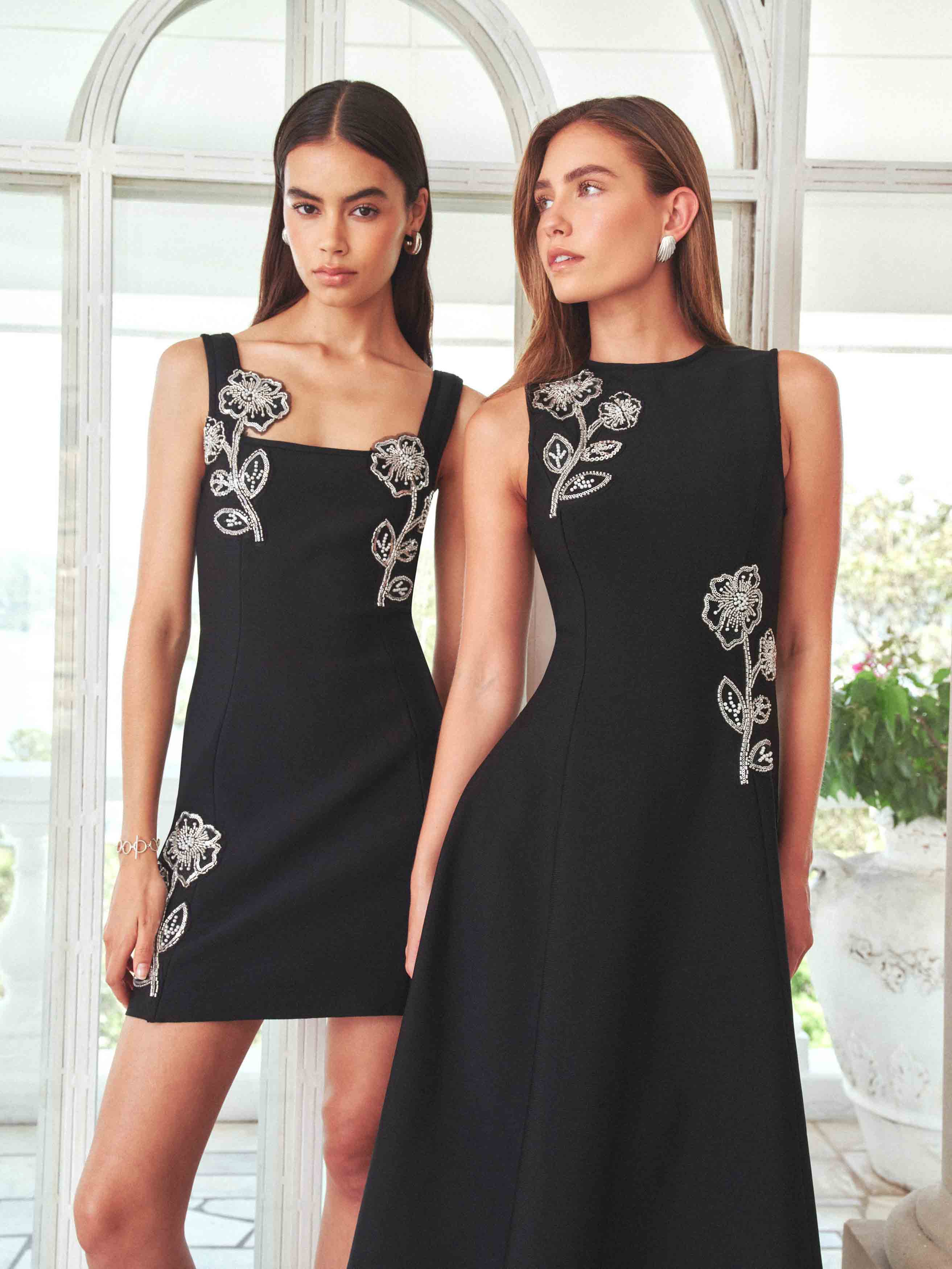 The strapless neckline highlights the shoulders and décolletage, creating a striking, sophisticated silhouette perfect for cocktail parties, black-tie weddings, or evening galas. Silver floral embroidery decorates the bodice and skirt, adding a touch of shimmer and delicate texture against the classic black base.